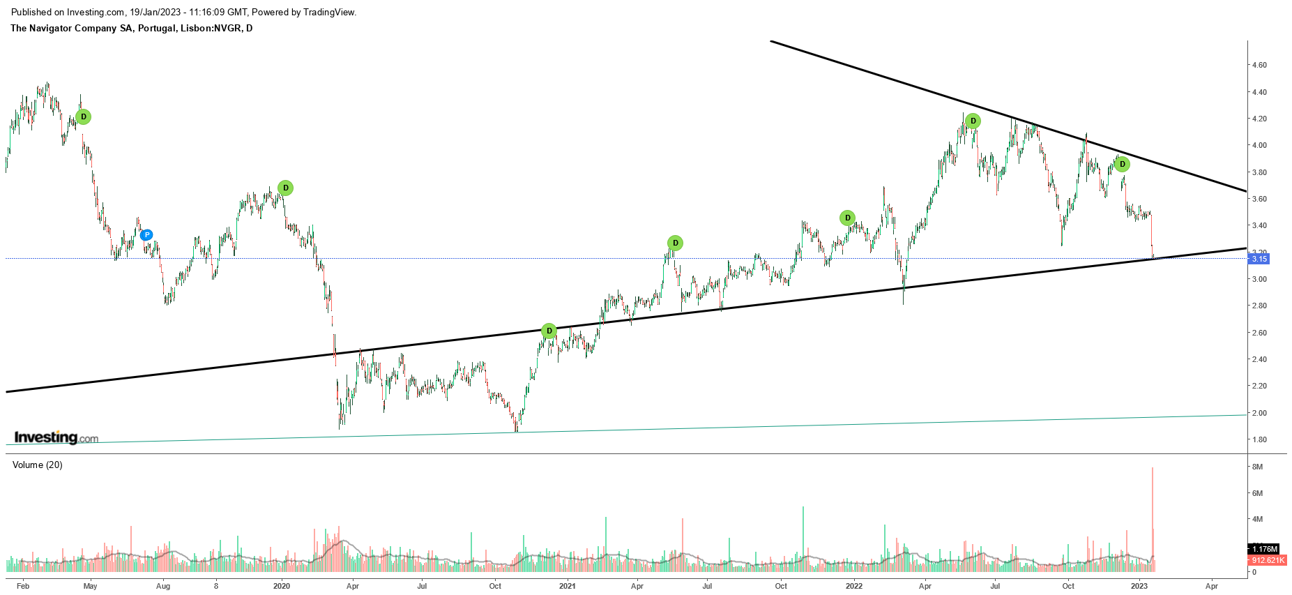 Relativamente à NVG, não me parece que o problema tenha sido baixar o price target, mas a fundamentação (previsão de queda brutal do ebidta), que faz todo o sentido. Negociar ações cíclicas é difícil, e o preço não reflete a situação atual, mas a futura - e se a NVG vai ter resultados record este ano fruto do preço da pasta, a cotação não vai esperar que este preço baixe (porque isso vai sempre acontecer) para refletir esse impacto. E não são os triângulos ou a bola de cristal (que, já agora, também te dava tantas certezas no esbardalhanço da Mota) que te vão ajudar a perceber isso.