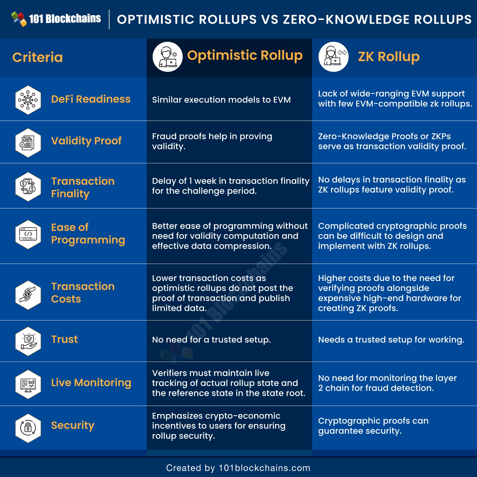 Atualmente, os dois principais tipos de rollups são o ZK e o Optimistic. O optimistic, assume uma postura mais otimista. Neste método é assumido que todas as evidências são verdadeiras até que se prove o contrário. O tempo de envio para a blockchain principal é mais demorado. No método ZK (zero knowledge), é possível validar as evidencias quase instantaneamente. Este mecanismo consegue garantir matematicamente a veracidade, ou não, das evidencias submetidas.