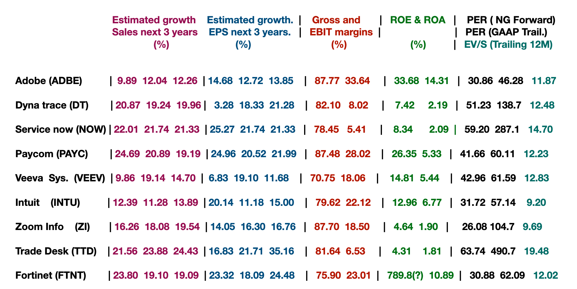 Se olharmos para a apresentação de resultados mais recente, de Maio último, a empresa apresentou um crescimento de receitas de 24%, uma margem operacional GAAP de 22% e uma margem de Free Cash Flow superior a 30%. As projecções para os próximos três anos apontam para crescimentos das receitas inferiores mas próximos a 20%. O EV/S (trailing) é ligeiramente acima de 9 e o Price to Sales P/S previsto para o próximo ano fiscal é de apenas 6.8. Para as margens e para o crescimento que apresenta, a empresa parece-me estar barata. Além disso, o parâmetro que relaciona a taxa de crescimento com a métrica de preço é o mais favorável de toda a lista acima, outra indicação de que a empresa está barata a este preço.