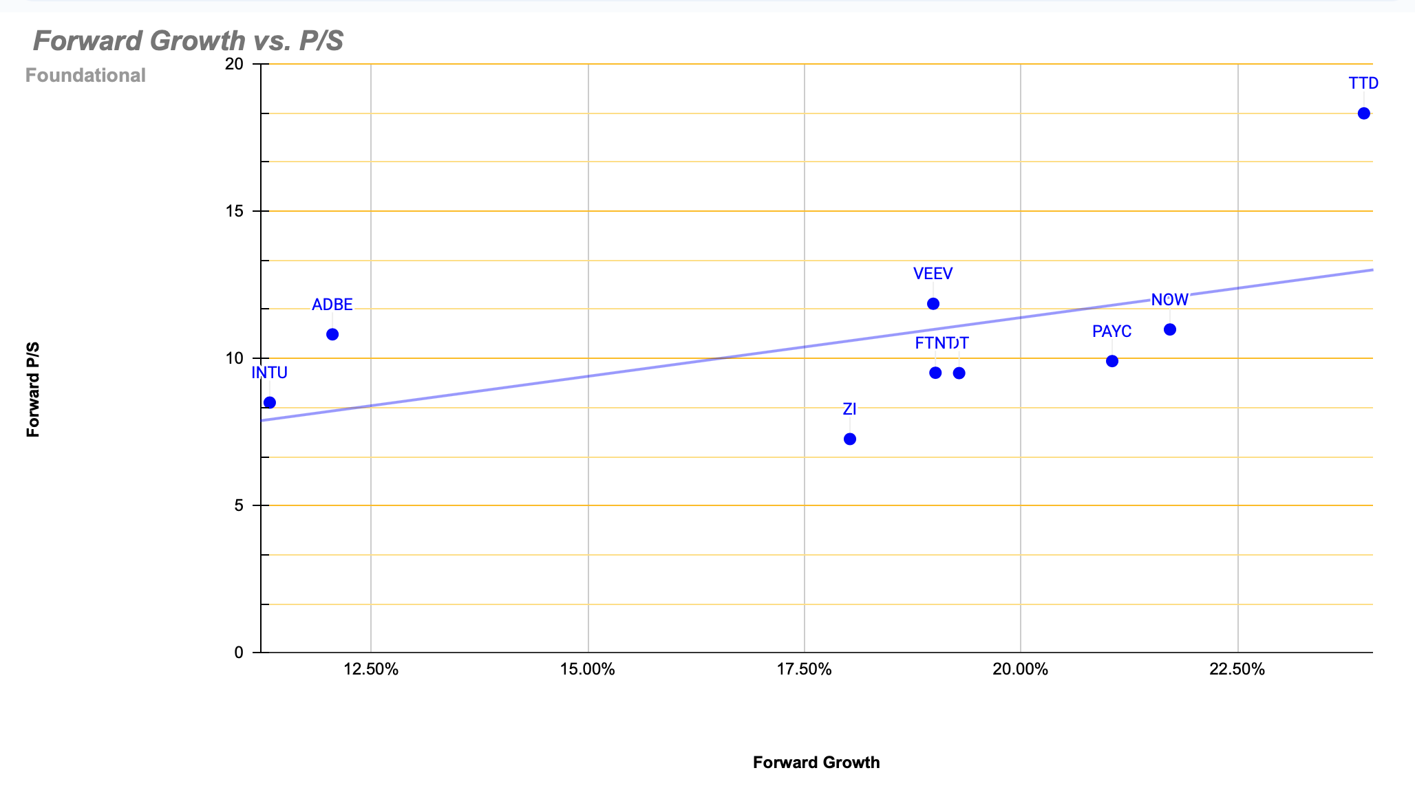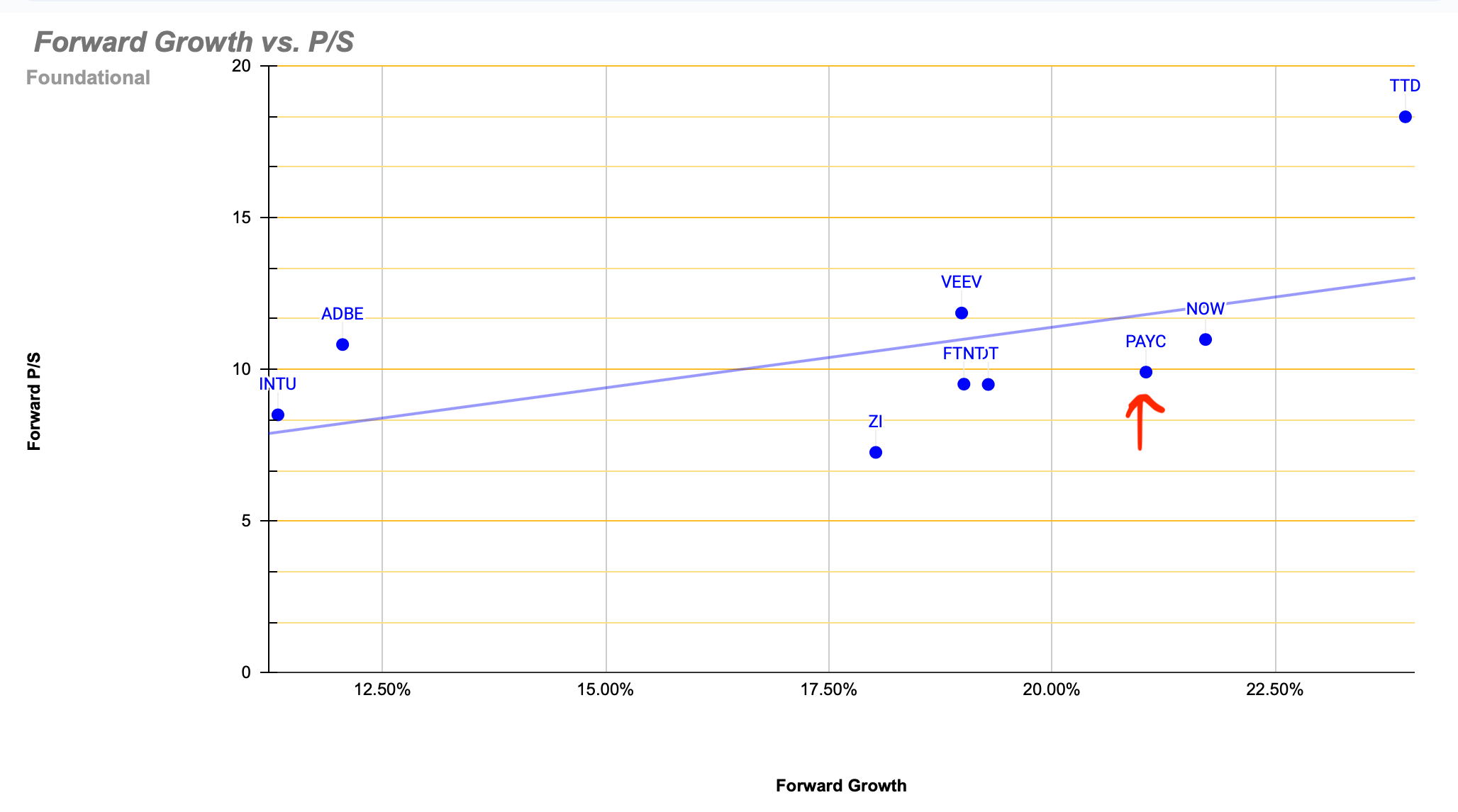 Portanto este é na verdade o gráfico growth vs. P/S para o próximo ano usando as previsões de receitas dos analistas.