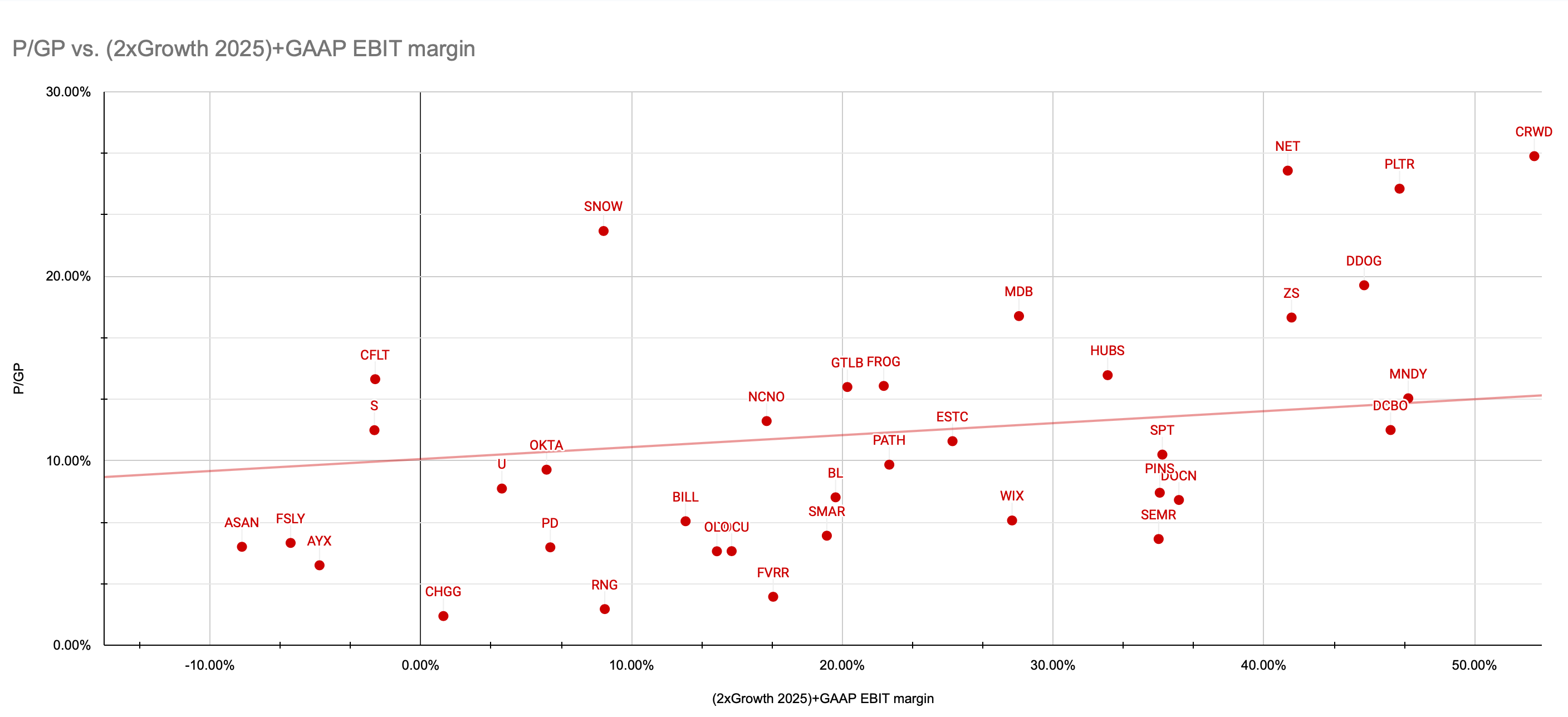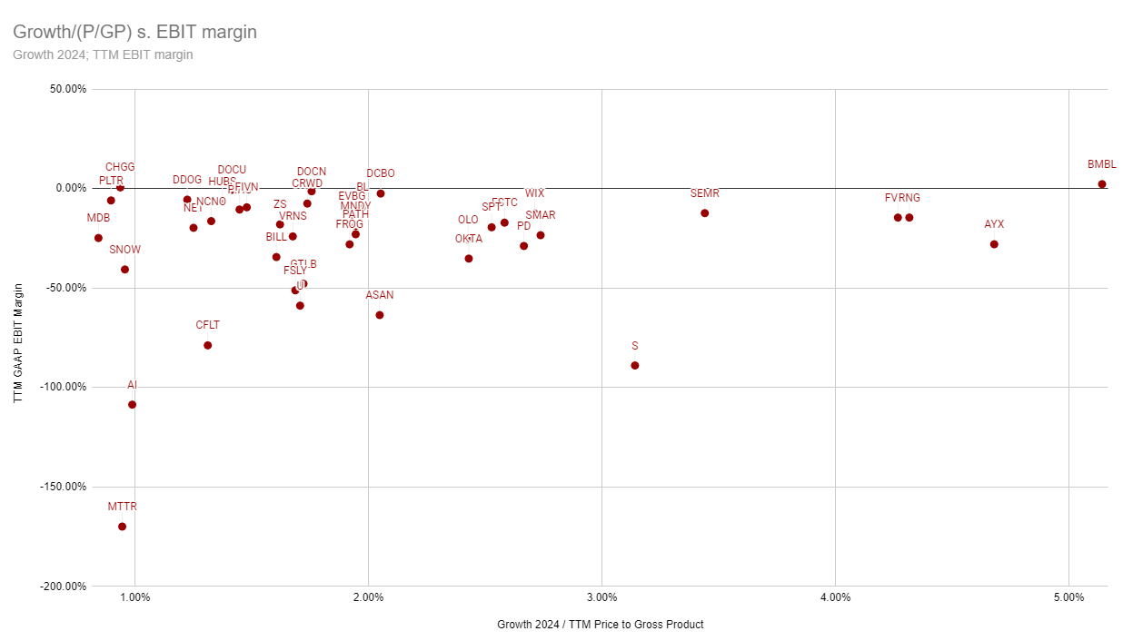 Note-se que este gráfico não leva em conta as margens. A Sentinel One (S) aparece aqui com um preço muito abaixo da média, mas na verdade tem também margens bruta e operacional bastante abaixo da média.