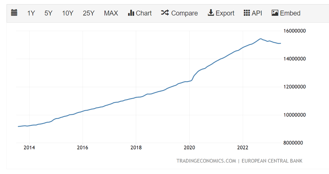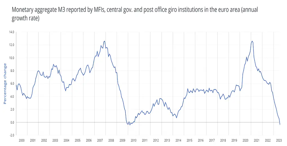 Para medir la oferta monetaria de la zona euro, el BCE utiliza la cifra "M3", que agrupa el efectivo, los depósitos bancarios (con vencimientos de hasta dos años) y otros activos financieros muy líquidos, como los fondos del mercado monetario. El descenso se debió a la caída de los depósitos a corto plazo en los bancos. Esto se debió a que los hogares, las empresas y las instituciones transfirieron fondos a depósitos a más largo plazo con mejores tipos de interés y a instrumentos de renta fija de mayor rendimiento. La ralentización del crédito bancario también contribuyó a la caída de los depósitos y, en consecuencia, del M3. Cuando los bancos ralentizan sus préstamos, circula menos dinero en forma de préstamos. Las personas y las empresas tienen menos dinero para depositar en los bancos. Y como M3 no sólo cuenta el efectivo físico, sino también varios tipos de depósitos, una disminución de los préstamos conduce a una menor cantidad de estos depósitos, haciendo que la masa monetaria M3 se reduzca.