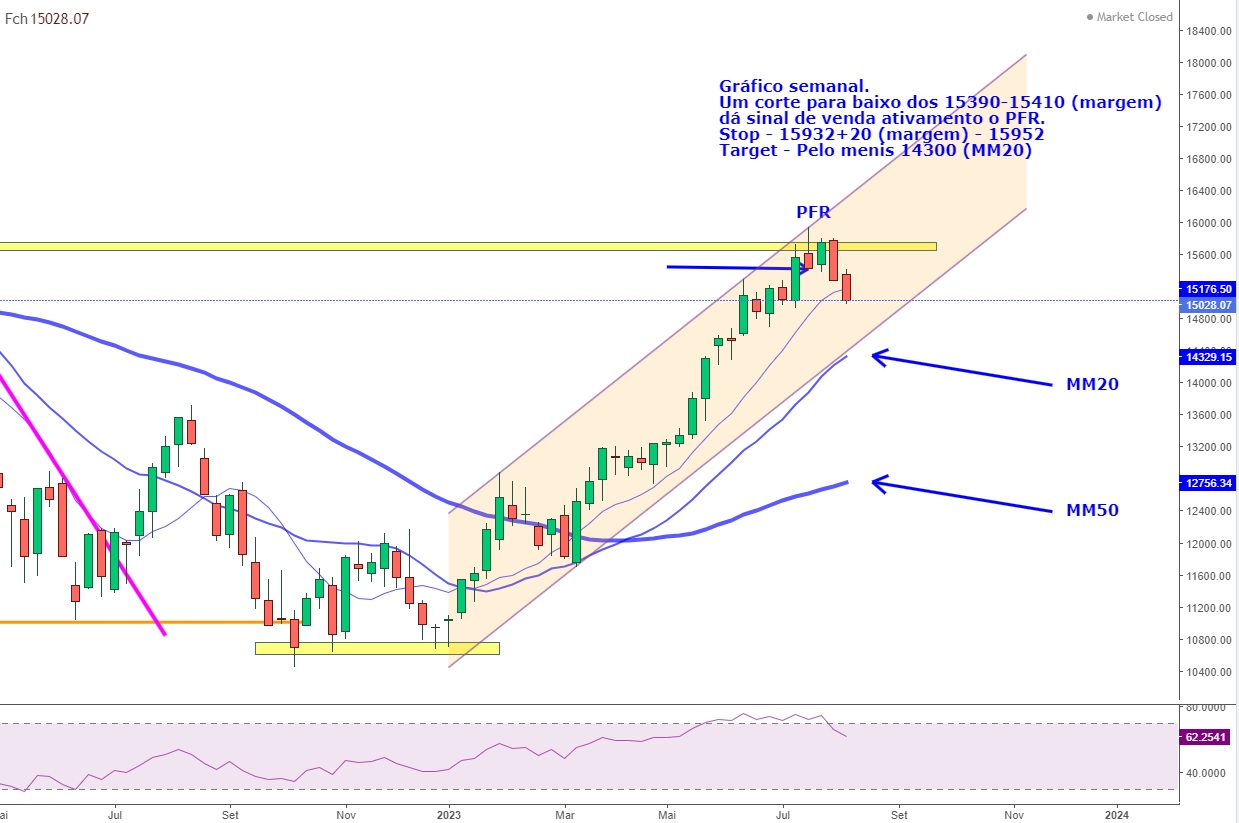 Agora estamos assim, mas o NDx100 está atrasado em relação ao spx que tem o topo do canal 1% acima, portanto ainda não entro curto, é esperar. Sendo que a estratégia passou a ser entrar curto nos topos. Posso estar a ver mal, mas a recessão vem aí, outra coisa é saber se -apesar disso- a febre da inteligência artificial leva o índice a maximos. Isso não sei. Penso que os longos fecham ali nas proximidades de 15300 e abrem curtos. É aí que espero entrar.