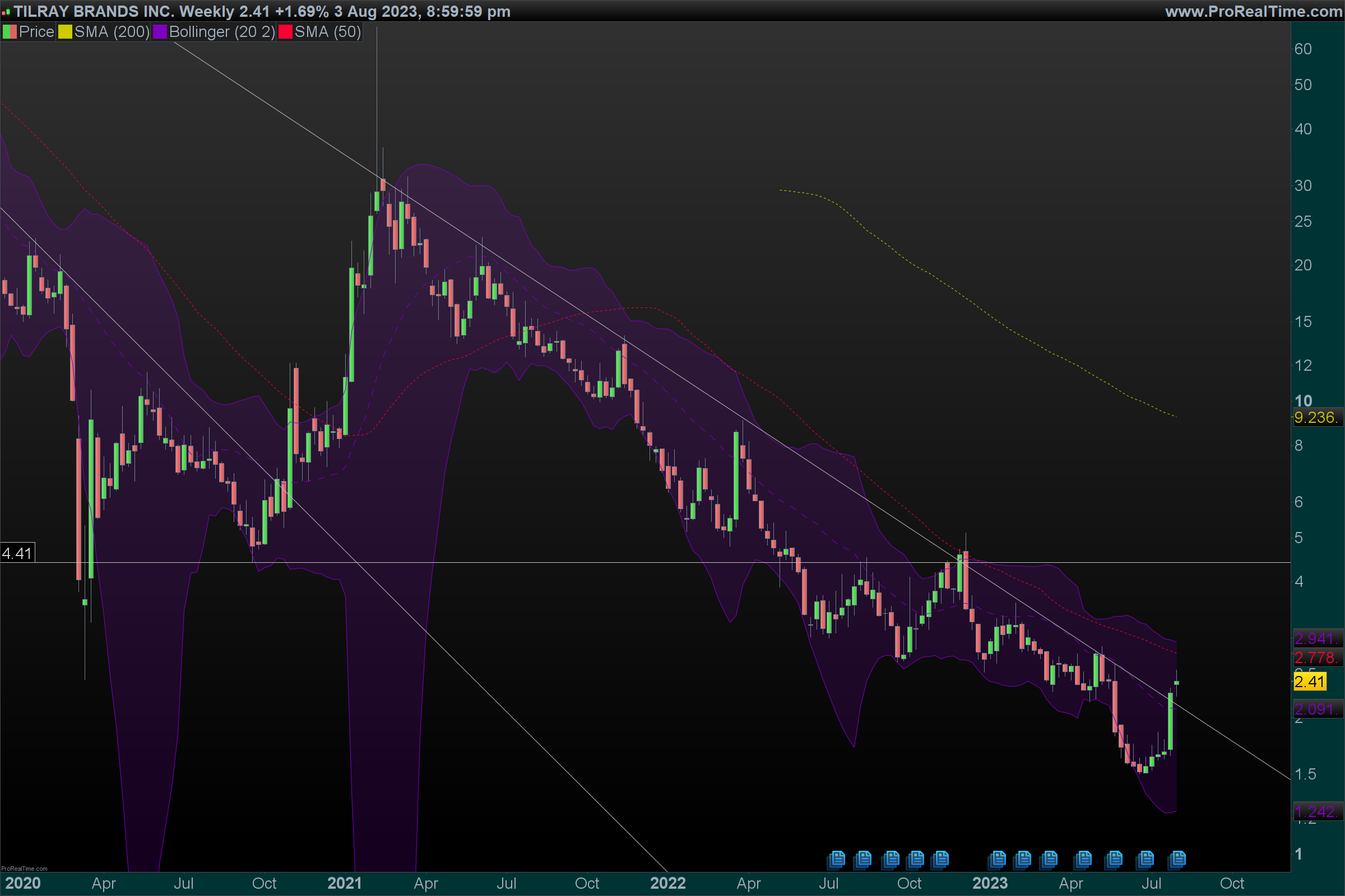 The all-time high Tilray Brands stock closing price was 214.06 on September 19, 2018. The Tilray Brands 52-week high stock price is 13.95, which is 285.4% above the current share price.