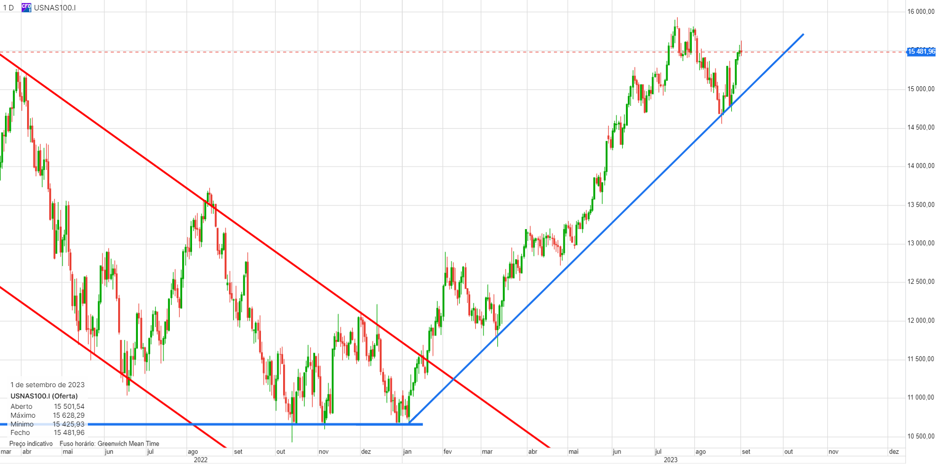 Não há muito a acrescentar. Reduzi a posição longa nos 15500, mas ainda fez 15600. O mais provável é passar os 16000 em breve, onde espero vender o resto da posição.