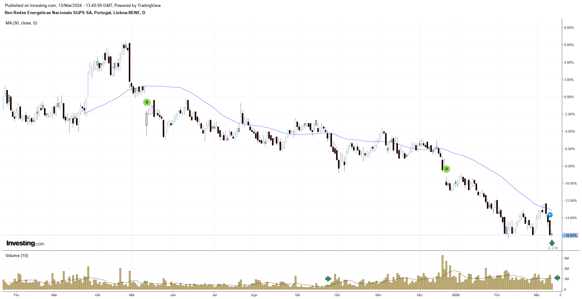 Deixo aqui o meu boneco da REN onde tracei uma linha diagonal tangente à linha tendência de descida de longo prazo.