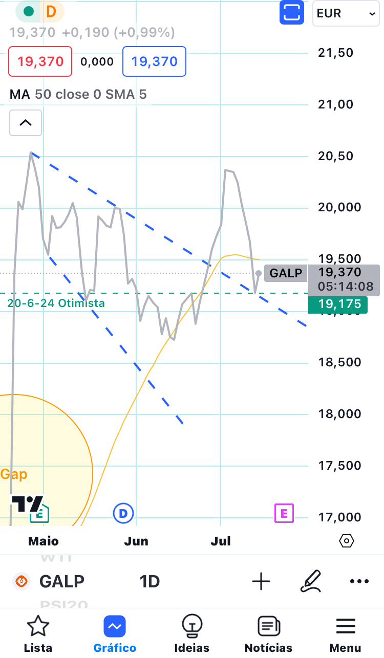 A Galp desceu hoje, mas também não parece estar com muita vontade de descer, porque recuperou na quinta feira parte do que desceu nesse dia e hoje desceu pouco. Acho que é mais provável que ela suba e não desça para fechar o gap, mas por causa do gap acho arriscada e por isso preferi dizer que ficava neutro.