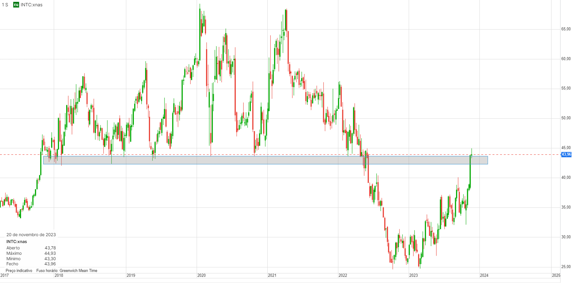 A Intel, na qual tenho uma posição longa (metade comprada perto dos máximos