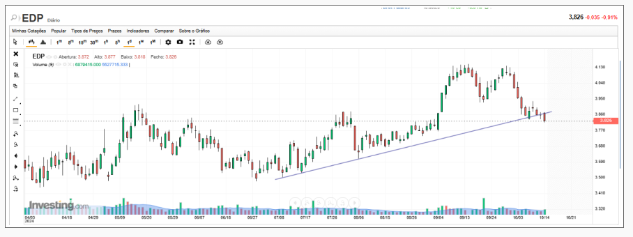 Em 01/05/2024 o gráfico mensal da EDP já tinha mostrado que a tendência seria de queda. Isso ainda não era visível, então, no gráfico diário da EDP (o gráfico mensal funciona de certo modo como um indicador avançado).