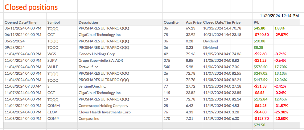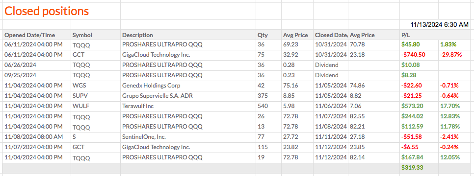 E criei um auxiliar para facilitar a colocação de preços de stop. Nas ações compradas perto dos máximos do ultimo ano (CLOV, COMM, AMSC, COMP, WULF), devia ter usado stops, e talvez também nos outros ativos. O auxiliar torna a atribuição de stops mais simples e menos aborrecida. Não vou usar stops agora, mas provavelmente mais tarde.