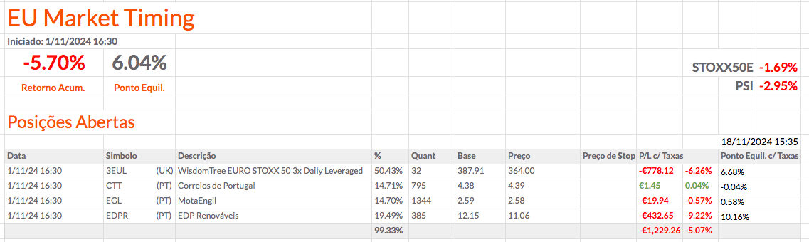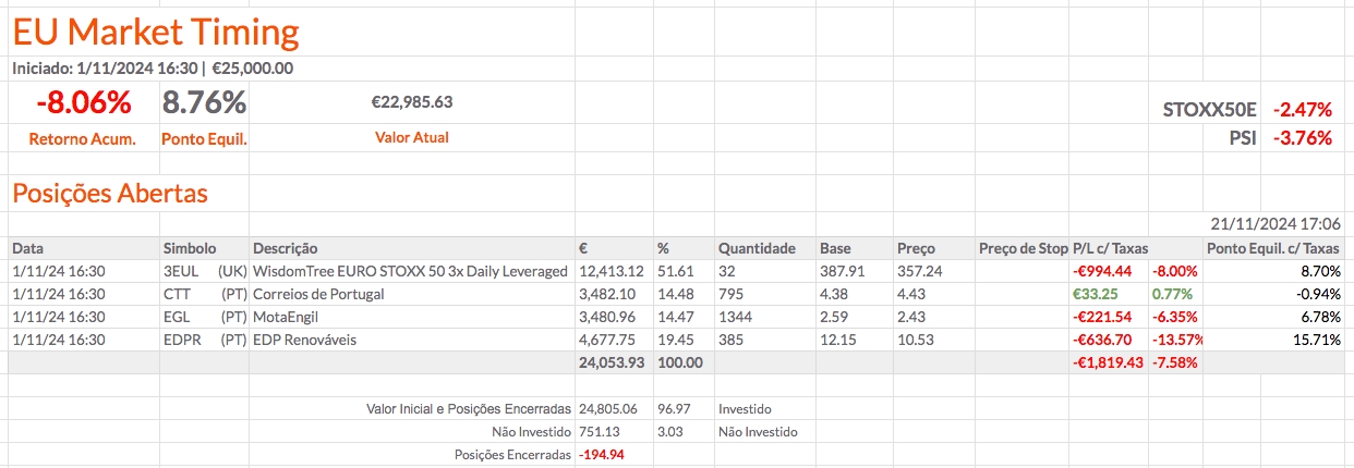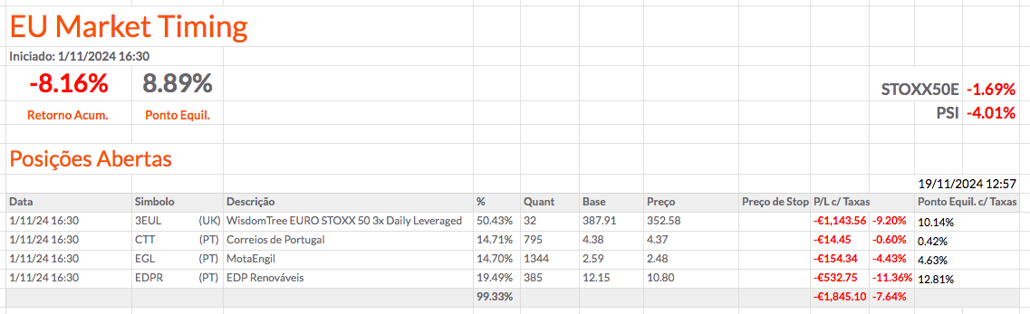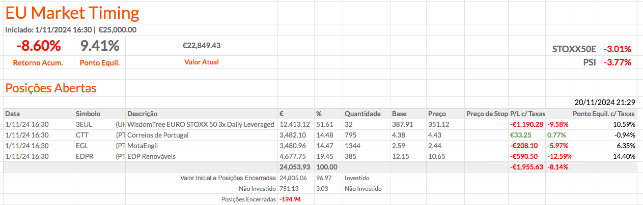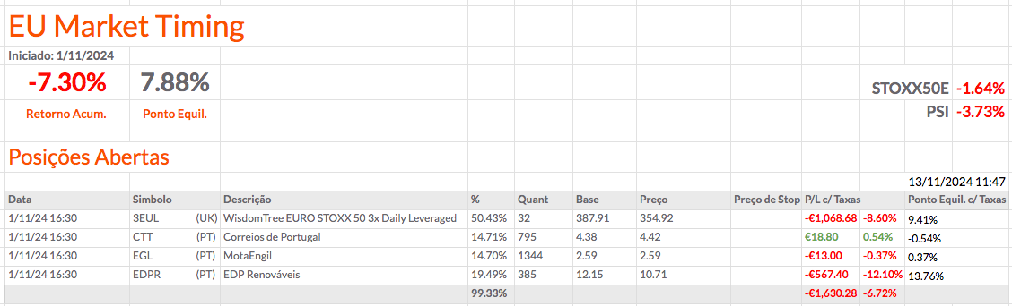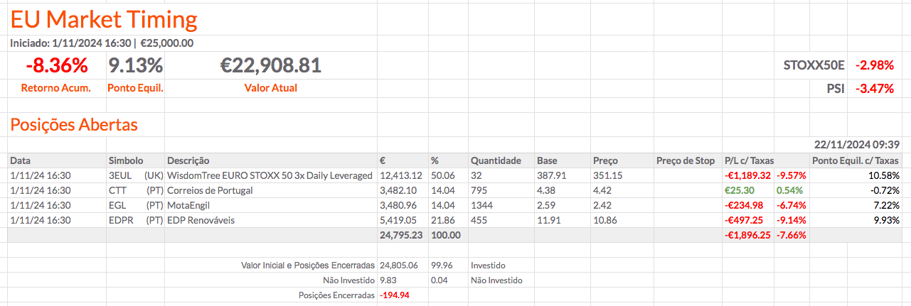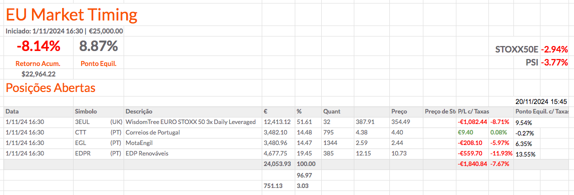 Fiz alterações nas percentagens das posições e acrescentei mais informação. Coloquei a percentagem de cada posição a depender apenas do montante investido. Em baixo coloquei a percentagem total que está investida e, mais abaixo, o montante e a percentagem que está por investir. Acho que ficou fixe. O resultado das carteiras não está fixe, mas ainda estou otimista.