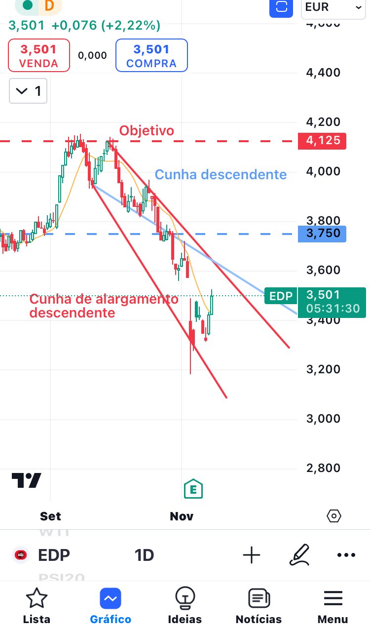 CTT e EDPR: mesma formação, cunha de alargamento descendente. Nos CTT, no gráfico diário, e na EDPR, no gráfico mensal. Ambas fizeram novos mínimos, abaixo da linha vermelha. Nos CTT, a ação já se aproxima do objetivo, na EDPR, ainda está na fase de evitar a descida e começar a subir