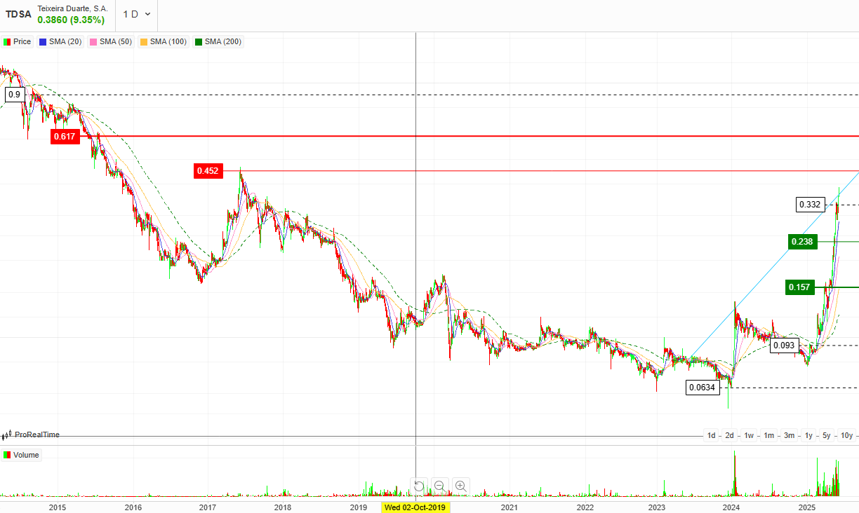 Bom dia a todos deixo aqui um rabisco do que para mim é previsível, e vejo isso de forma simples traçando umas linhas que todos entendemos, o próximo patamar está na casa dos 0,45€ de seguida de existir ainda mais força iremos sem dúvida à casa dos 0,62€ isto analisando o gráfico historicamente e ainda sendo mais otimista a casa dos 0,90€ não é impossível claro com o devido tempo, sempre ouvi dizer Roma e Pavia não se fizeram num dia.