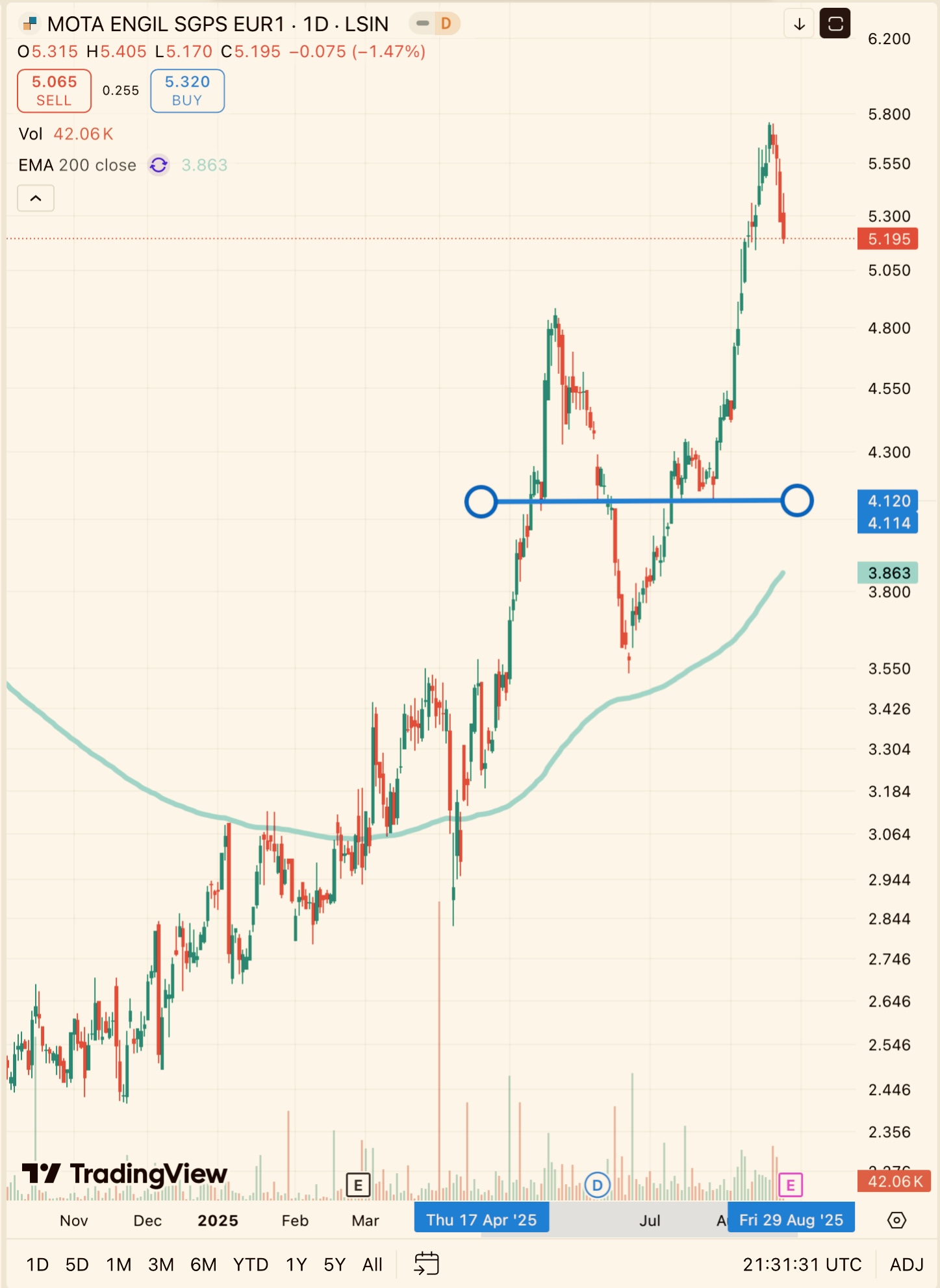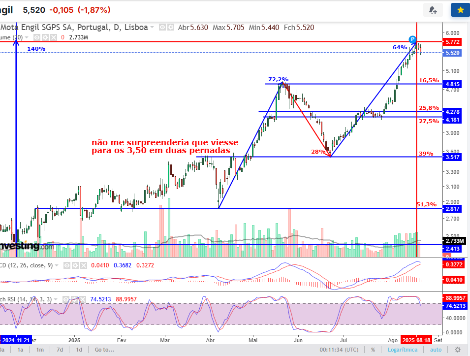 No muito curto prazo a correção era previsível, o RSI e o MACD estavam em máximos e a Mota raramente aguenta esse nível por muito tempo.
