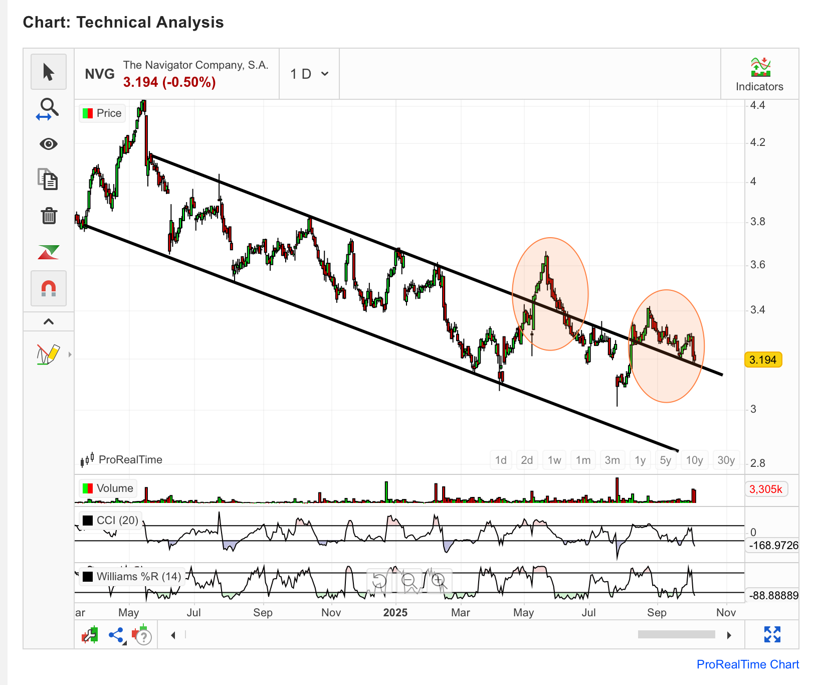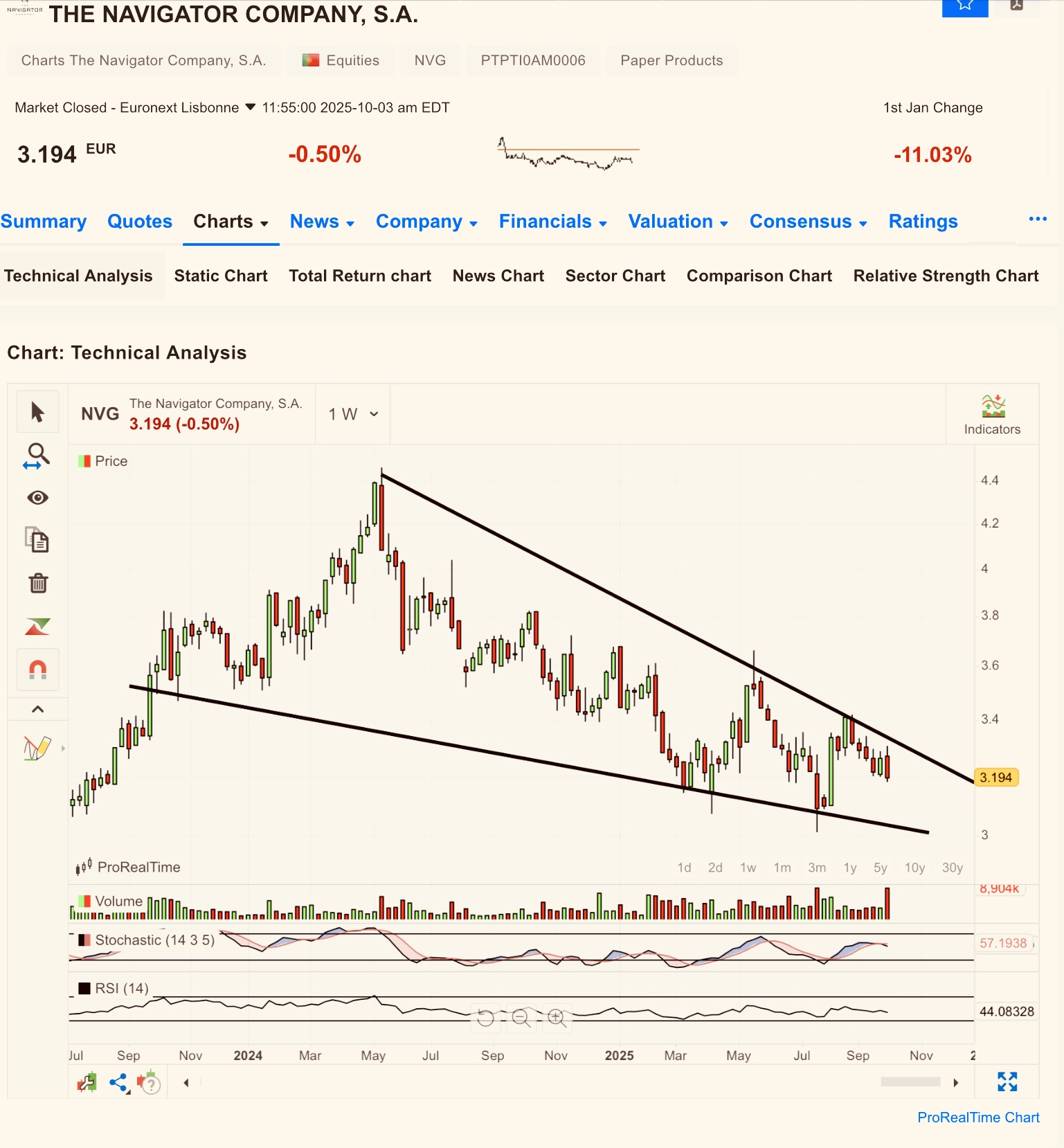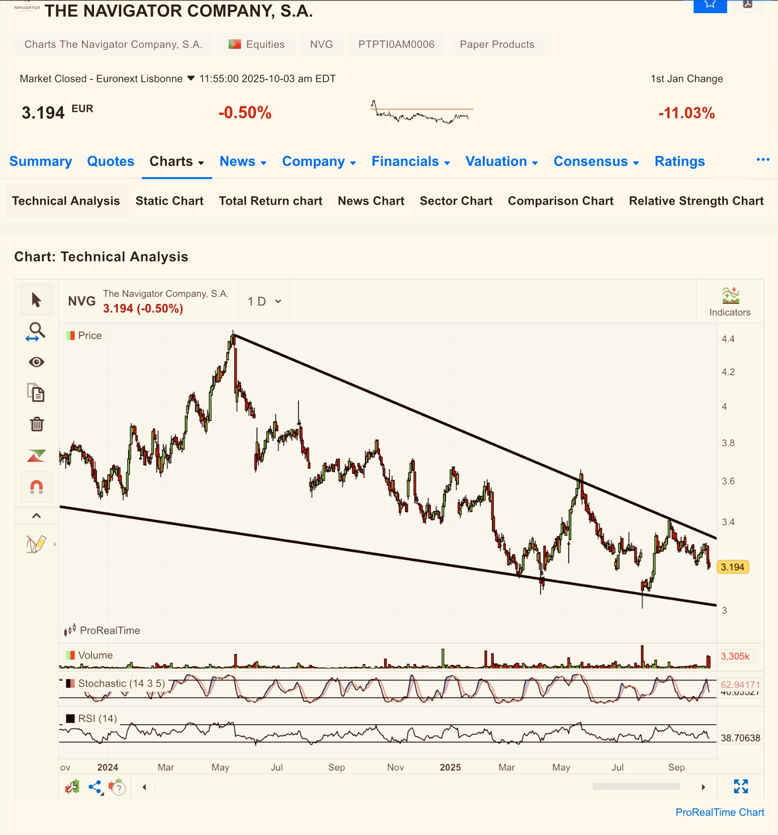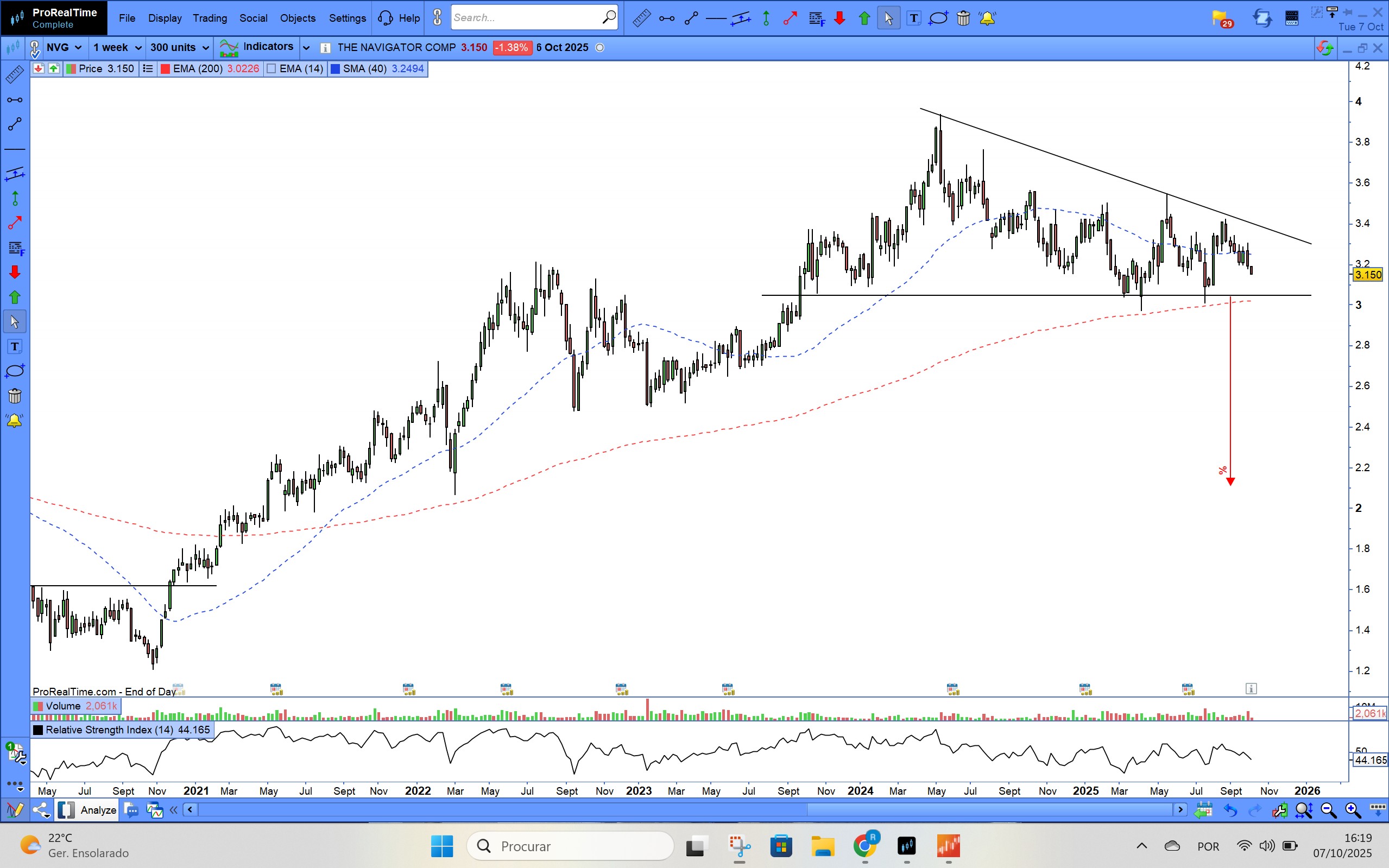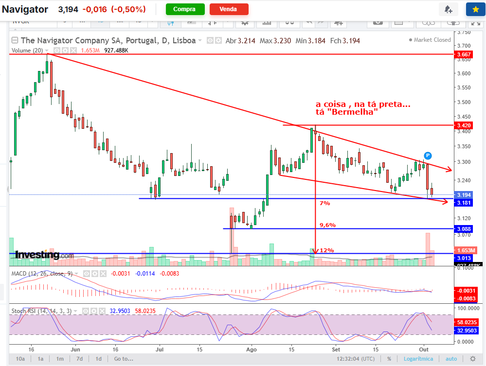 Em termos de AT para quem está a médio/longo prazo na ação acho que temos a zona dos 3,10 como um bom suporte, não prevejo qualquer subida acima dos níveis atuais e é mais que provável um teste aos 3,00, Até 22 de outubro é previsível um pequeno ressalto uns 2 ou 3 dias antes que poderá ser uma oportunidade para fechar a posição.