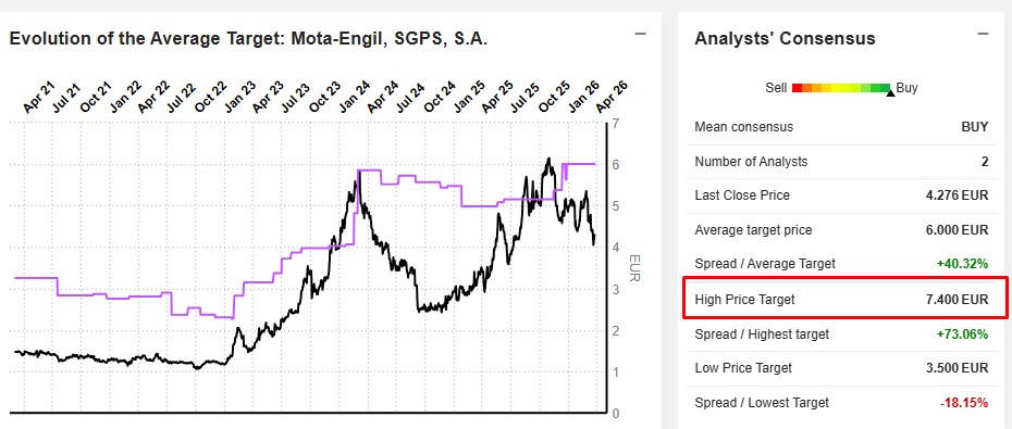 Note que, segundo o MarketScreener o maior price target da Mota-Engil está neste momento a 7.40€ (valor a um ano), esse PT é recente e terá sido atualizado perto do final do ano passado.
