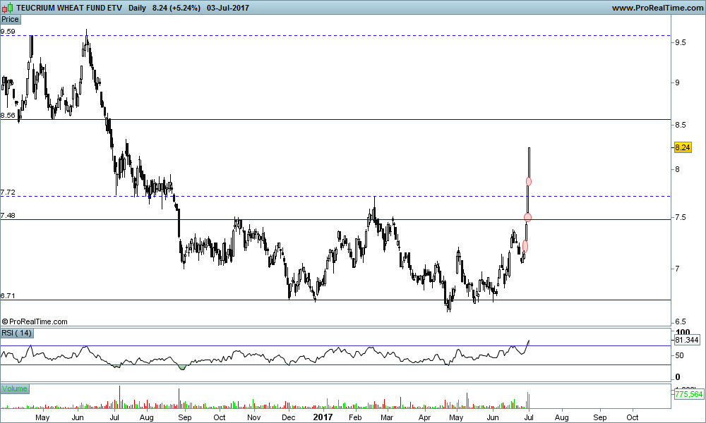 Deixo gráficos diário e semanal de um ETF que segue esta commodity (WEAT) e está numa zona interessante onde pode validar o duplo fundo, confirmando inversão de curto prazo. O target para este movimento seria aproximadamente na próxima resistência.