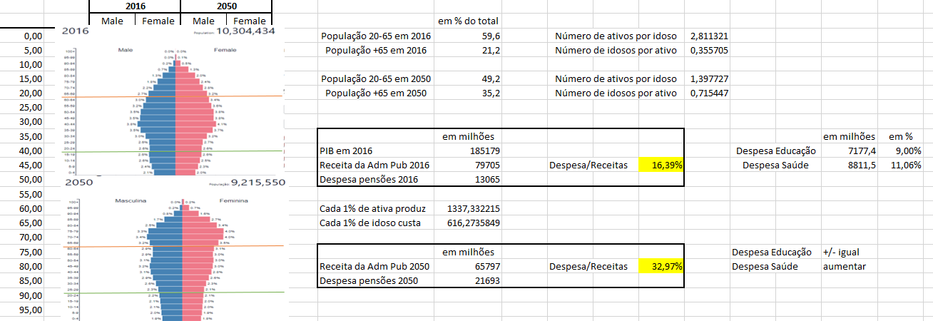 Agora o interessante será observar as consequências da baixa taxa de natalidade no sistema de pensões atual para 2050. A meu ver quanto antes se fizerem as devidas políticas estruturais melhor... uma delas poderia ser a existência de um teto máximo. O excel poderia ter tido muito mais coisas em consideração, mas assim já dá para ter uma ideia geral. Basicamente o que foi feito é utilizar os valores demográficos de 2050 para a situação atual assumindo-se que a receita da Administração Pública depende apenas da população ativa. Tendo em contas as expectativas o número de pessoas entre os 20-65 por idoso irá cair para metade até 2050