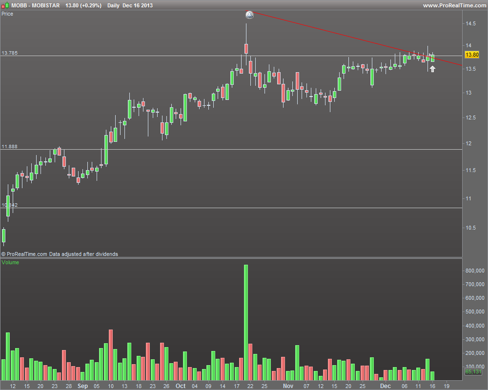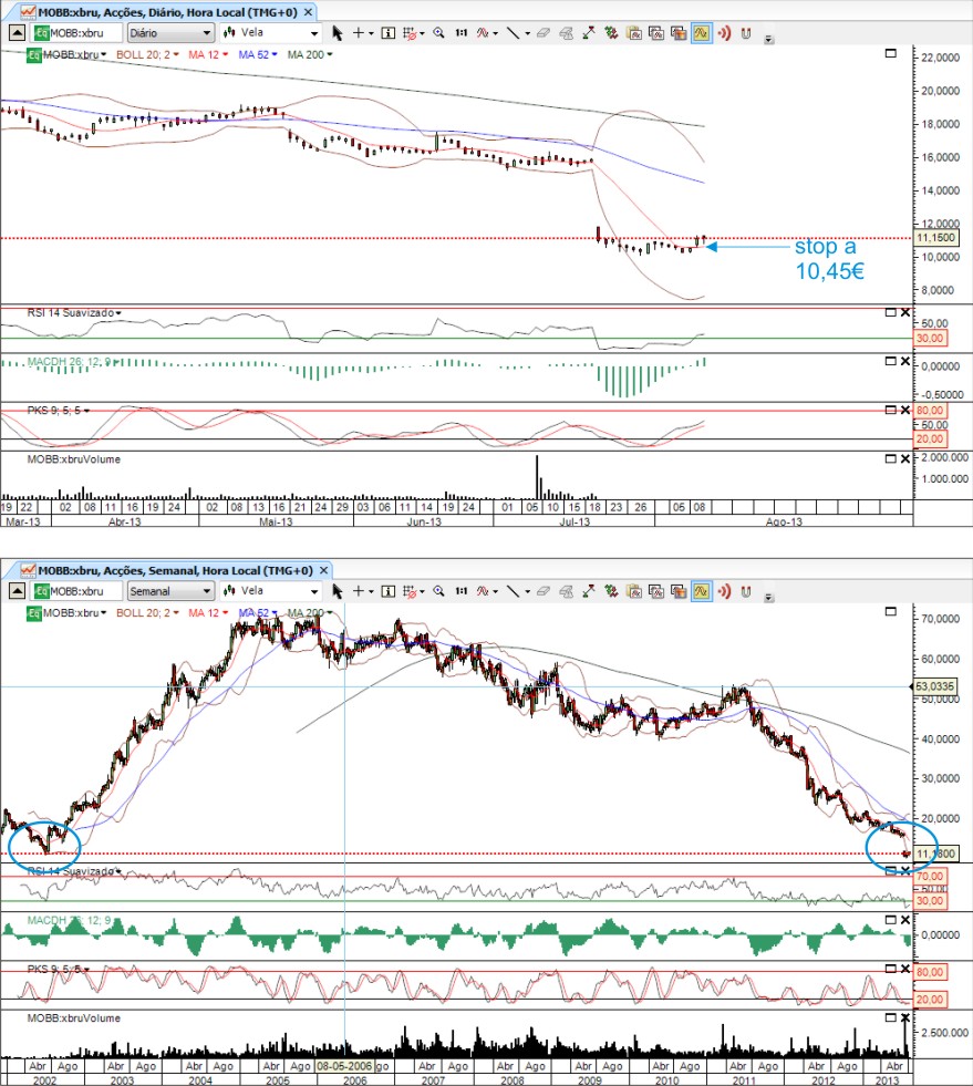 Ontem escrevi aqui que as telecoms andavam pouco interessantes tecnicamente, mas no caso da belga Mobistar isso não se aplica de todo: o título está em máximos de dois anos e meio.