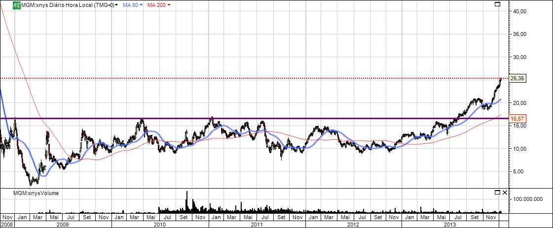 A MGM está neste momento sobre uma resistencia enorme. Desde final de 2008 que a MGM está a cotar abaixo de 16,60$. Já teve pelo menos 6 tentativas falhadas, o que atesta a sua força.