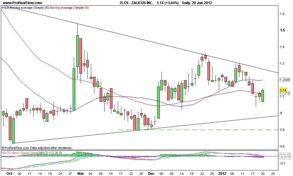 " Shares of Zalicus Inc (NASDAQ:ZLCS) could be in the early stages of a technical breakout. The stock closed right at its 200 day MA on the daily chart on heavy volume. Although recently the stock has been on a pull back today's 19.75% gain to $1.10 per share shows the stock may be on the rise again. The technical chart looks like it's set up and ready to go. I will be watching very closely for news. ZLCS looks like it wants to run. "