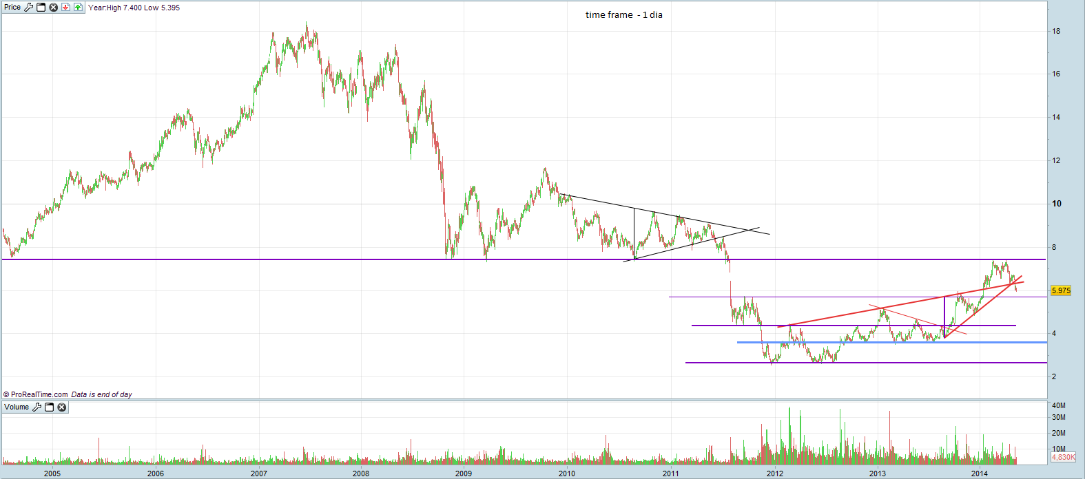Depois de a ação ter fechado um grande gap e ter testado uma forte resistência em torno dos 7.5€ com a formação de um duplo topo, está agora em queda, ficando com mau aspeto após ter quebrado duas linhas de tendência, aproxima-se agora de um suporte em torno dos 5.65, 5.75 (mais ou menos), a ver como vai ser a reação.