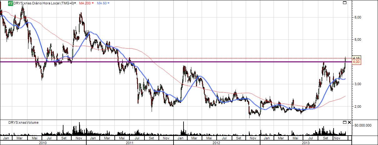 Infelizmente nem sempre posso responder de imediato. A DRYS registou na passada 6ªfeira um máximo dos ultimos 4 meses, fechando ligeiramente abaixo da sua maior resistência que se encontra nos 2.62, ou seja, a sua média exponencial dos 200 periodos. Um fecho acima deste nivel, será o ponto de viragem para o titulo.