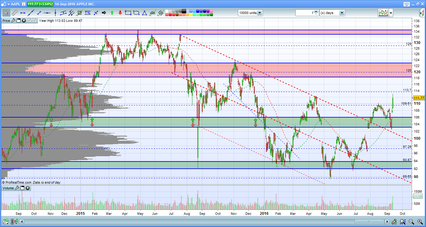 Depois de um periodo de estagnação, a APPLE apresentou resultados superiores ao previsto no final de Julho, que levaram a acção novamente para cima dos 100 USD.