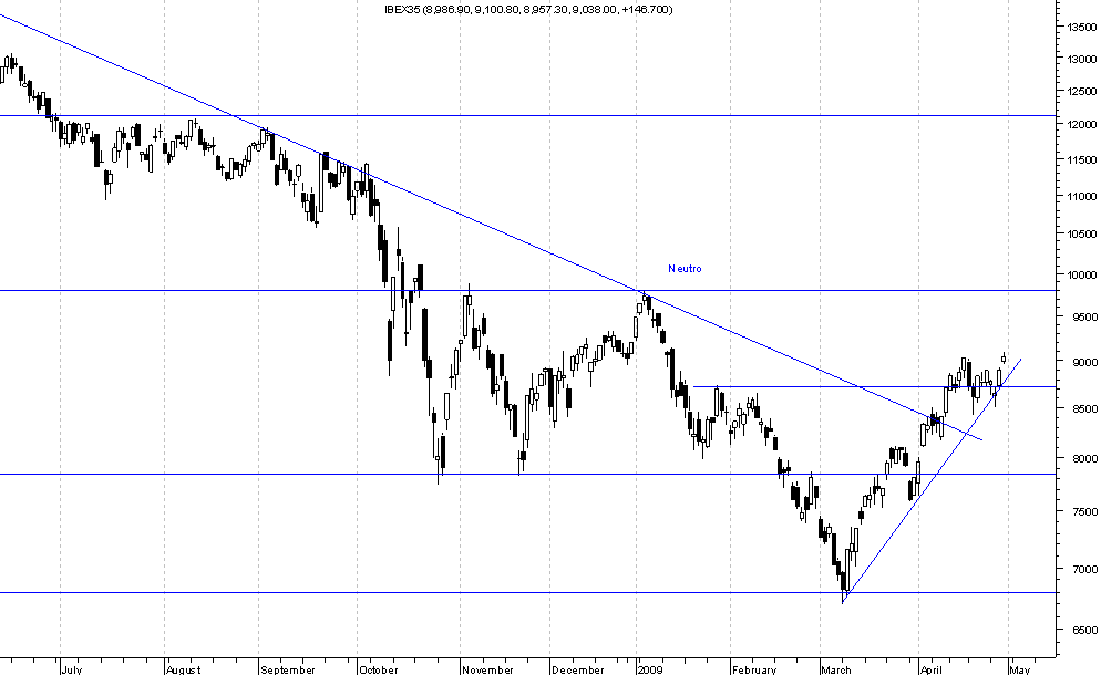 O IBEX35 está com um "desenho" semelhante aos seus congéneres. Depois de ter passsado grande parte de Abril a marinar em torno dos 8700 pontos parece ter encontrado força para ir testar a fundamental resistência dos 9800 pontos