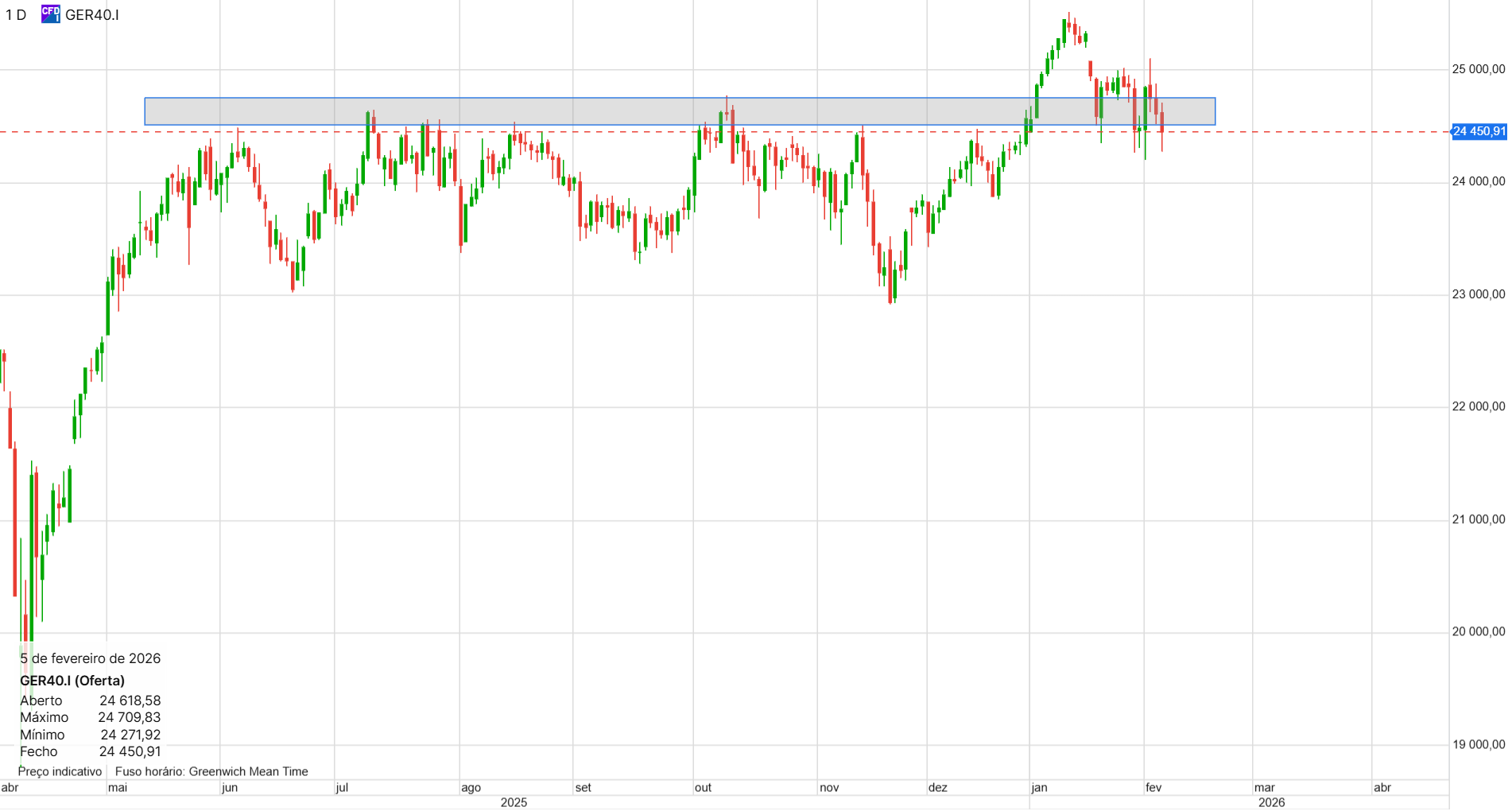 O Dax rompeu a resistência (zona a cinzento) dos anteriores máximos, fez novos máximos e depois quebrou em baixa. Encontra-se agora a testar novamente a resistência a cinzento.