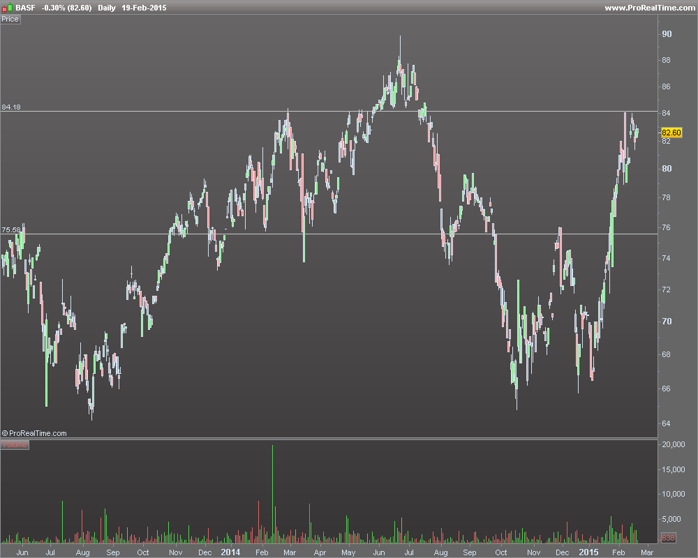 A BASF tem sido um dos motores do DAX (pelo peso que tem no índice), aproxima-se agora de uma zona crítica: a hiper-mega-super-resistência dos 76 euros.