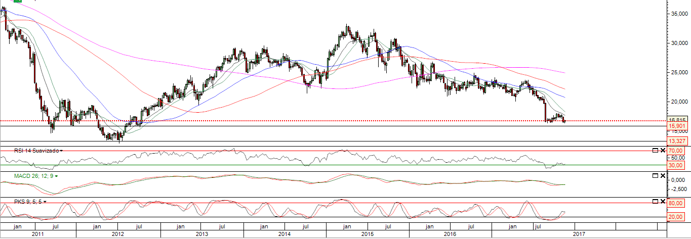 A Carrefour parece não ter força. Está a consolidar no fundo anterior recente. Tem sentido colocar um trade curto um pouco abaixo do suporte, com stop no máximo relativo anterior. O trade tem um risco de 10% se se efetivar, logo ajustar a quantidade para definir o valor de perda.