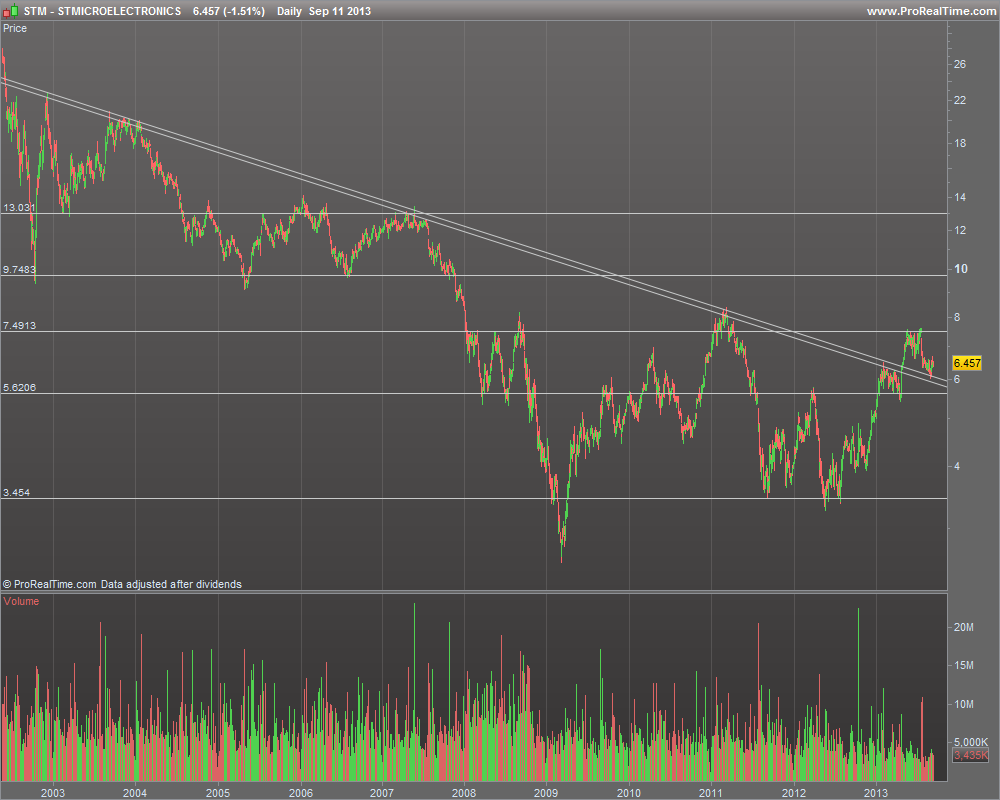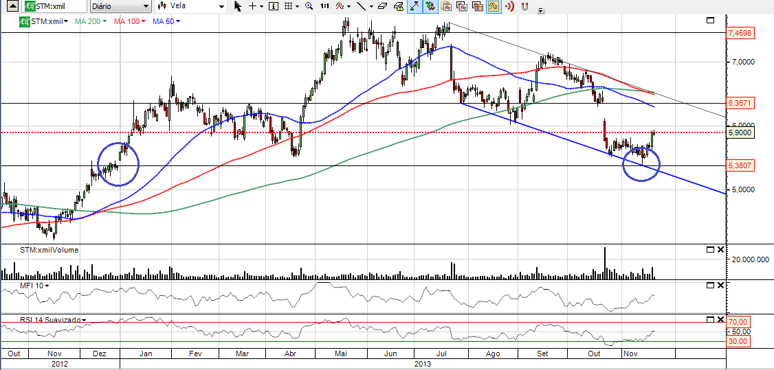 NO caso da STM o que vemos é uma tendência de muito curto prazo ascendente (gráfico de 30 minutos) e uma tendência de médio prazo descendente (gráfico diário).