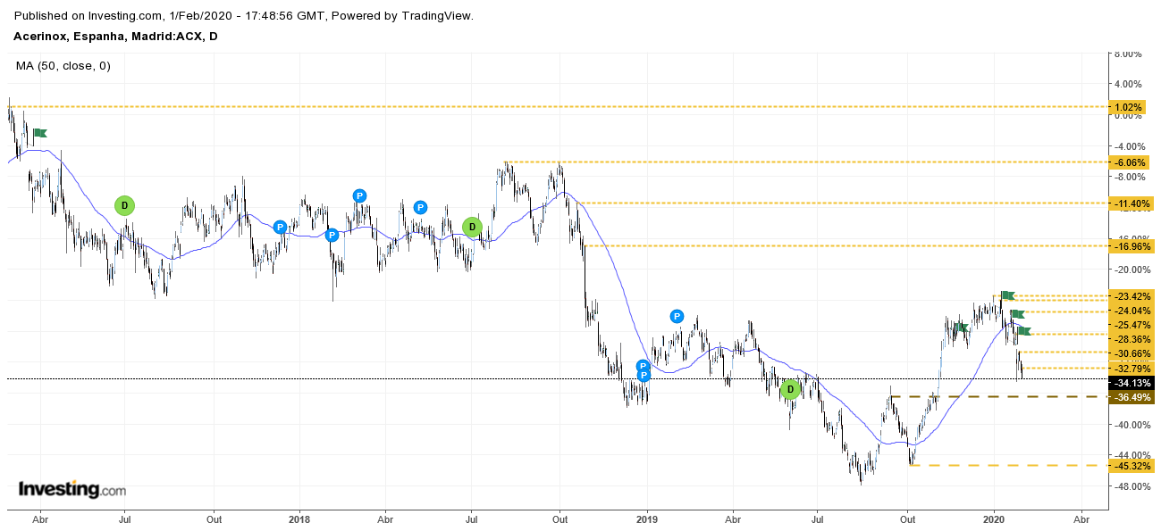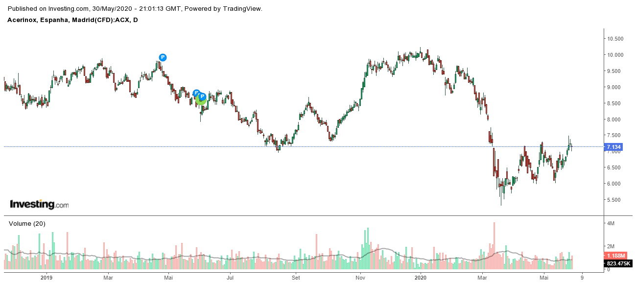 No longo prazo (há mais de 1 ano) a Acerinox segue a transaccionar dentro de um canal de lateralização muito bem definido entre os € 11,90 e os € 15,10, mas isto não a tem impedido de, de tempos em tempos, consolidar ligeiras tendências ascendentes e descendentes.