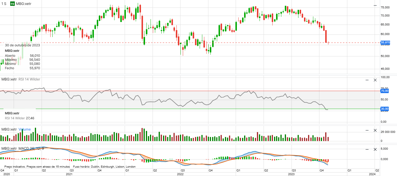 Em termos técnicos, estamos a falar de uma ação bear de médio prazo, au pair com as congéneres Alemãs (BMW, VW), ronda o SF1 intermédio nos 65.55 e tem o SF2 decisivo nos 62.40. As 4 MMS (20,50,100,200), foram todas quebradas e neste momento a ação tenta contrariar a Tendência descendente, estando oversold e com o RSI/MACD a propiciar uma reentrada especulativa de curto prazo (vai ter de ressaltar e recuperar uns 5 a 10%). Upside potential real de 25%/Downside de 35%.