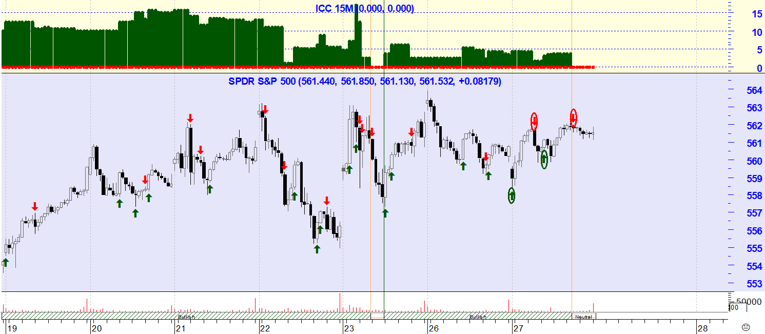 2) O segundo sinal do dia coincidiu com uma venda oscilatória no mesmo gráfico por volta do meio da sessão, tendo como consequência o fecho da posição longa oscilatória indicada atrás em 1) (ver venda assinalada a vermelho no 2º gráfico do S&P 500 no período dos 15 Minutos).