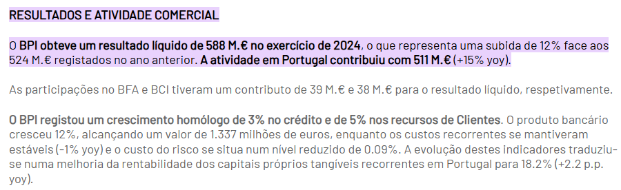 Saíram hoje os resultados do BPI e foram muitos bons, o Bankinter Pt igual, estou com esperanças nestes resultados. A carteira de CH aumentou 5% face ao ano passado (2023), O credito no geral aumentou 3% yoy. As margens continuam sem afetar muito as contas dos bancos. Deixo a seguir o link dos resultados do BPI: https://www.bancobpi.pt/particulares/re ... 5%25%20yoy).
