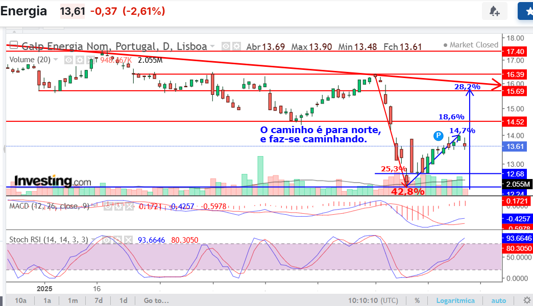 A quebra sustentada dos 14,18 € poderá abrir caminho para os níveis seguintes, mantendo o cenário técnico construtivo. Como sempre, convém acompanhar também os desenvolvimentos fundamentais e geopolíticos — mas tecnicamente, a ação está com bom setup.