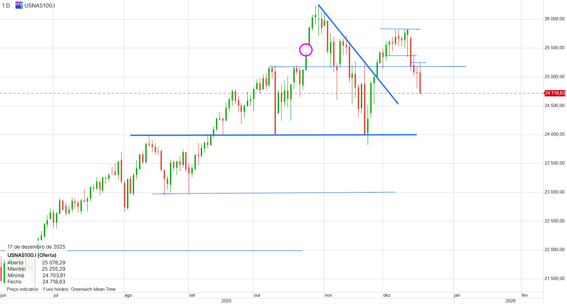 Não tenho posições, mas espero abrir uma longa amanhã (o ideal era fazer um teste aos 25200, seria o ponto ideal de entrada).