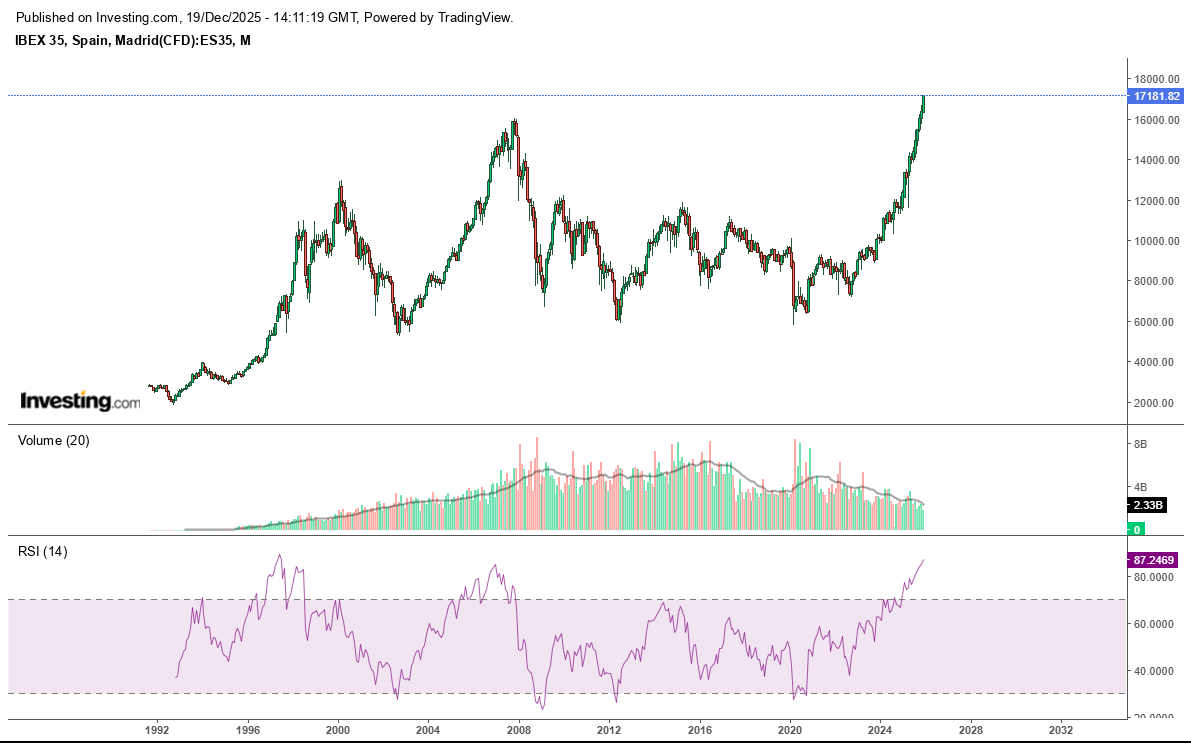 Criei o tópico na altura que o DAX estava com comportamento bolha e se bem que não rebentou completamente, desde então lateralizou. Portanto o comportamento não esteve assim tão mal estimado. Honestamente aposto num ciclo de reversão para breve na Europa (pelo gráfico do DAX que deve arrastar o resto dos índices). A hipótese mantêm-se com um ultimo suspiro para cima nos primeiros trimestres 2026 ou começo já da queda com quebra do retângulo.
