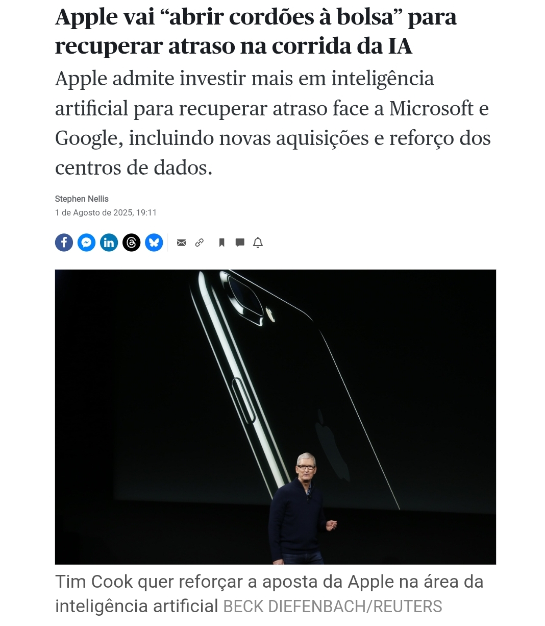 Nunca fomos os primeiros em nada e depois acabamos por ser os melhores em tudo, responde Tim Cook aos acionistas que criticam o atraso da Apple na corrida à Inteligência Artificial.