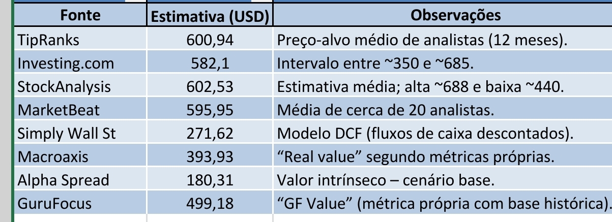 O consenso dos analistas é amplamente positivo, com uma classificação média de "Strong Buy" e um preço-alvo médio de $304 (9 Strong Buy, 12 Buy e 3 Hold). Os analistas mais recentes, i.e. duas últimas semanas, reiteraram o Buy com preços alvo entre $250 e $275.