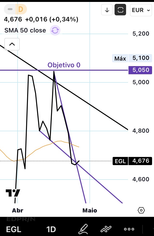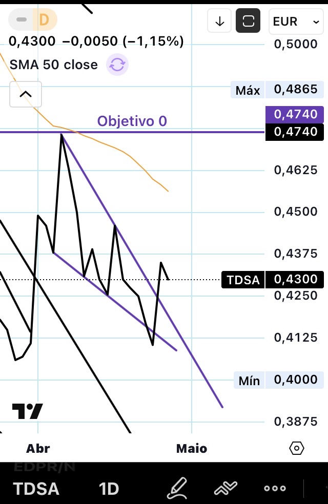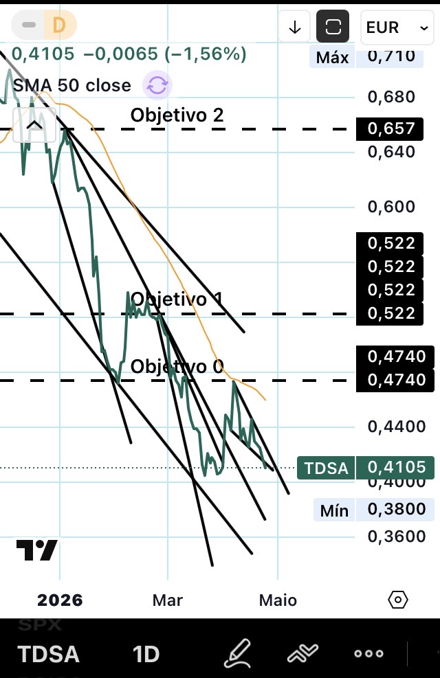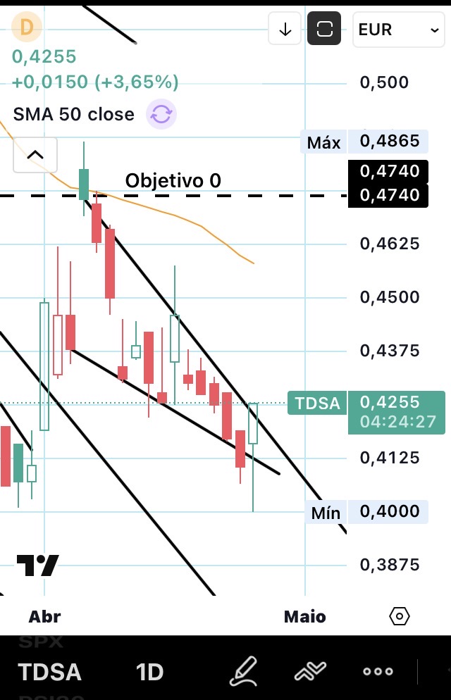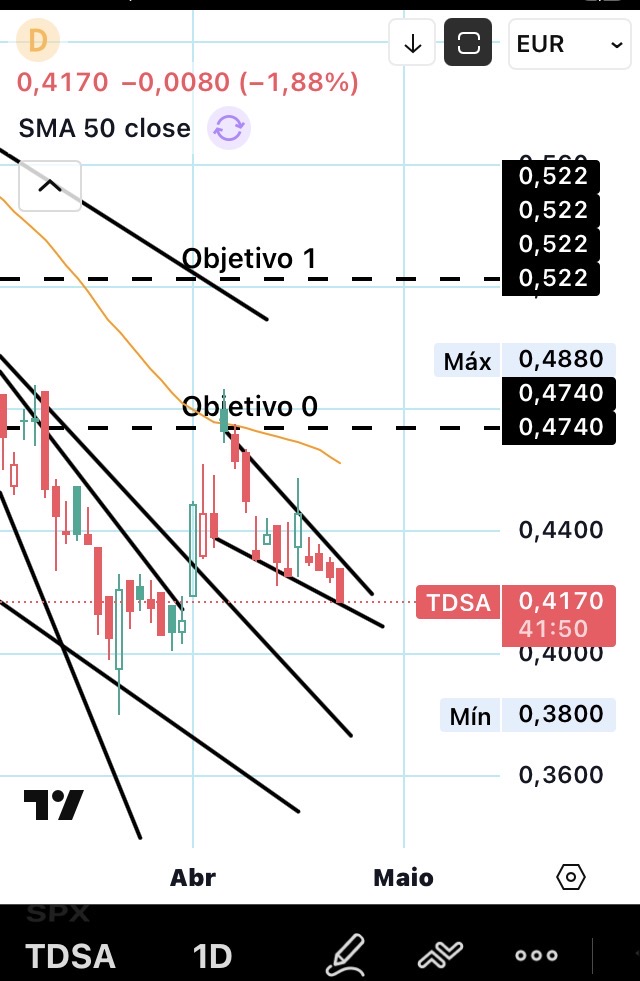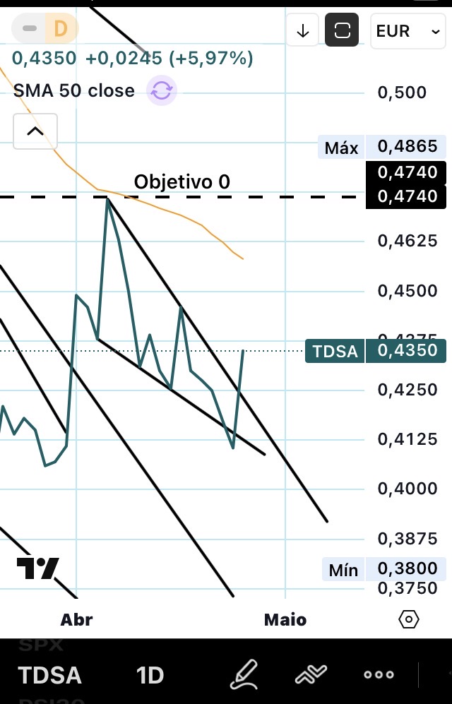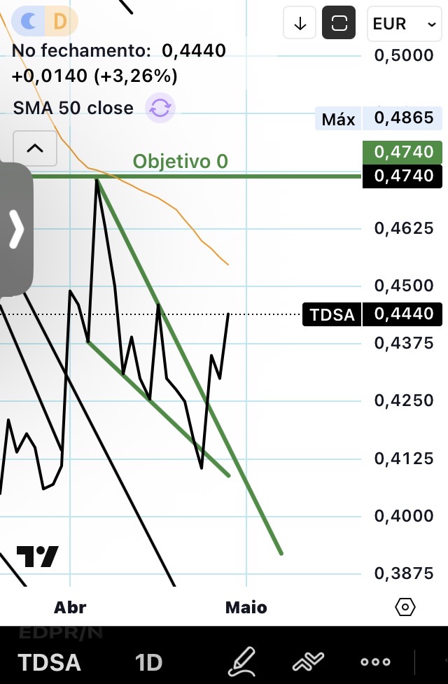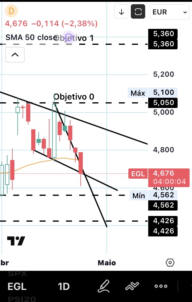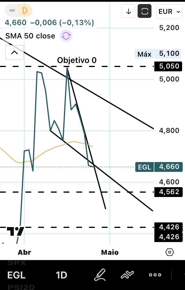 Tanto a TDSA como a EGL têm vindo a ficar mais próximas do objetivo 0. Tenho atualizado ambas ao mesmo tempo porque os movimentos têm sido semelhantes, e acho que isso torna um pouco menos difícil perceber o que podem estar a fazer. Por exemplo, a cunha descendente foi mais evidente primeiro na TDSA, e depois tornou-se visível que a EGL também podia ter uma. Claro que isto é sempre um pouco subjetivo, há sempre muitas interpretações diferentes dos gráficos, o que até é engraçado, sobretudo quando se está certo, mas no fim é sempre o Sr, Mercado que decide quem está certo ou errado. Há também alturas em que é mais simples do que em outras. Às vezes, o preço ainda vai dar umas voltas antes de chegar ao objetivo, principalmente quando surgem acontecimentos novos. Sem acontecimentos extraordinários, acho que é mais simples, ou pelo menos menos difícil.