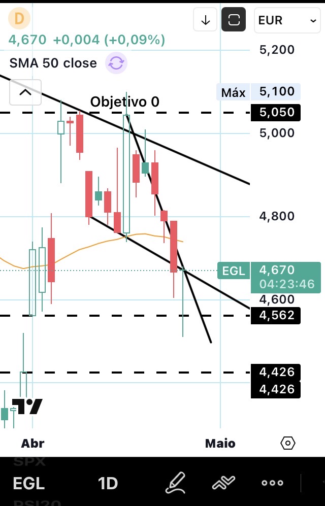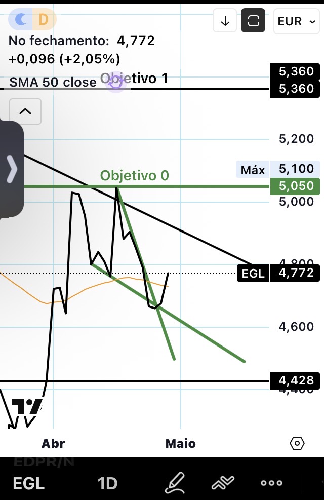 Este gráfico da Egl tem as mesmas linhas do gráfico de linhas que coloquei ontem, mas com o gráfico de candlesticks e mais aproximado consegue-se ver melhor que subiu depois de tocar nas linhas de suporte, e que ontem desceu até à anterior linha de resistência, que agora funciona como suporte, após a abertura em alta, e que hoje a subida está a continuar.
