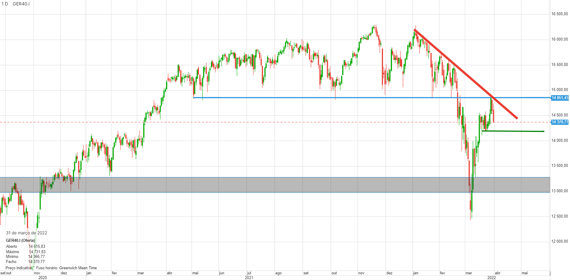 Mas o que aqui interessa é que a subida desde os 13000, até aos 14700, revelou-se um ressalto. Agora vamos ver o que acontece, que do antecedente, o DAx mostrou-se um osso duro de roer e nunca quebrou à primeira, nem à segunda.