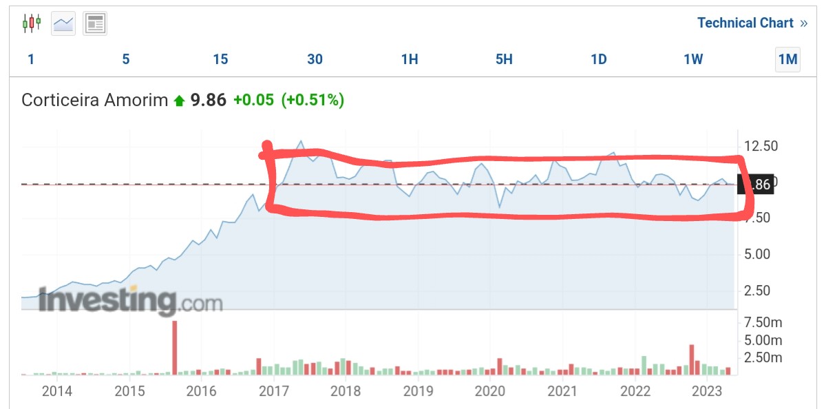A Corticeira teve uma subida brutal até 2017, mas desde então não sai do quadrado que oscila entre os 8€ e os 12€.