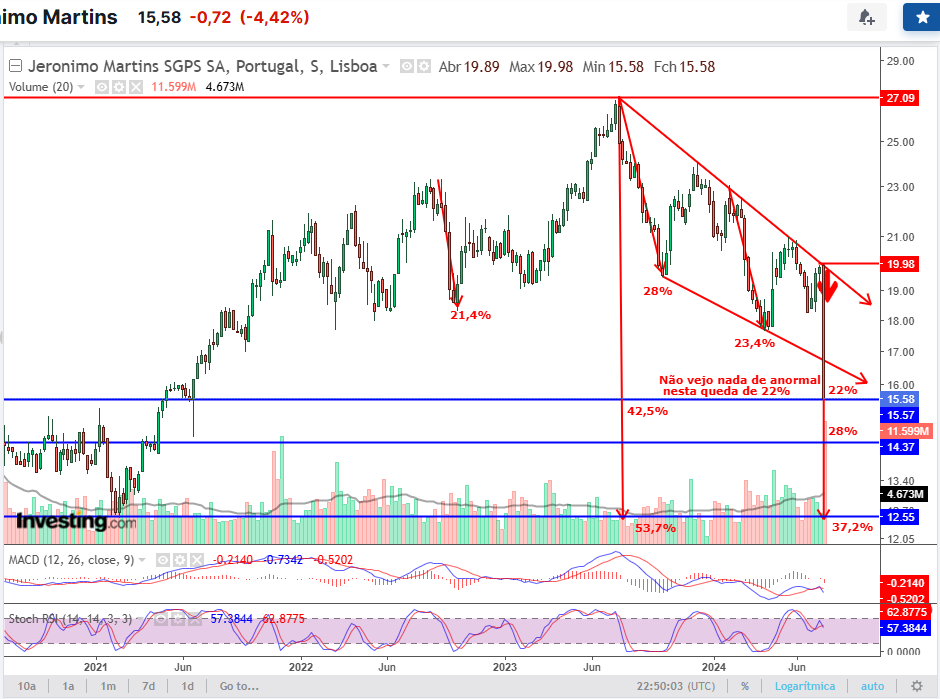 O que estamos a ver na JMT é uma demonstração de fragilidade muito grande, caiu 16% e nao esboçou qq reação de recuperação. Entretanto ja fez mais 4 dias de quedas acumulando mais ~6%.