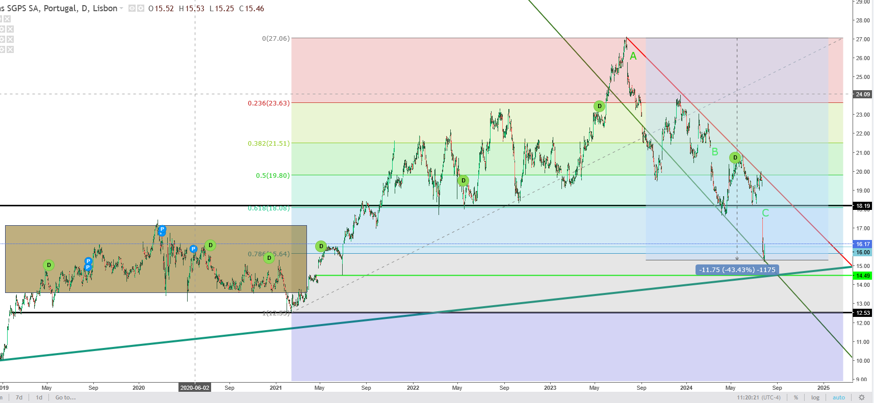 PS faltou dizer que espero retracement até à LTD - e ao antigo suporte horizontal - na zona dos 18,50/19, dependendo do número de semanas (se for rápido, maior a probabilidade dos 19)