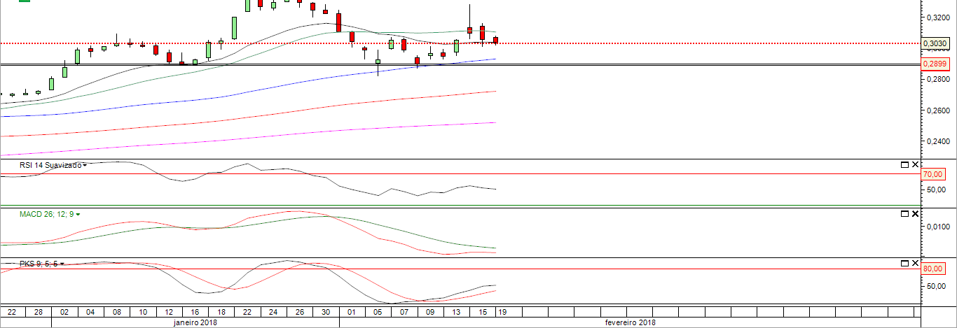 A expectativa é que nos próximos dias possa testar o crucial suporte dos 0.2880 e ai veremos se segura o titulo ou quebra em definitivo.