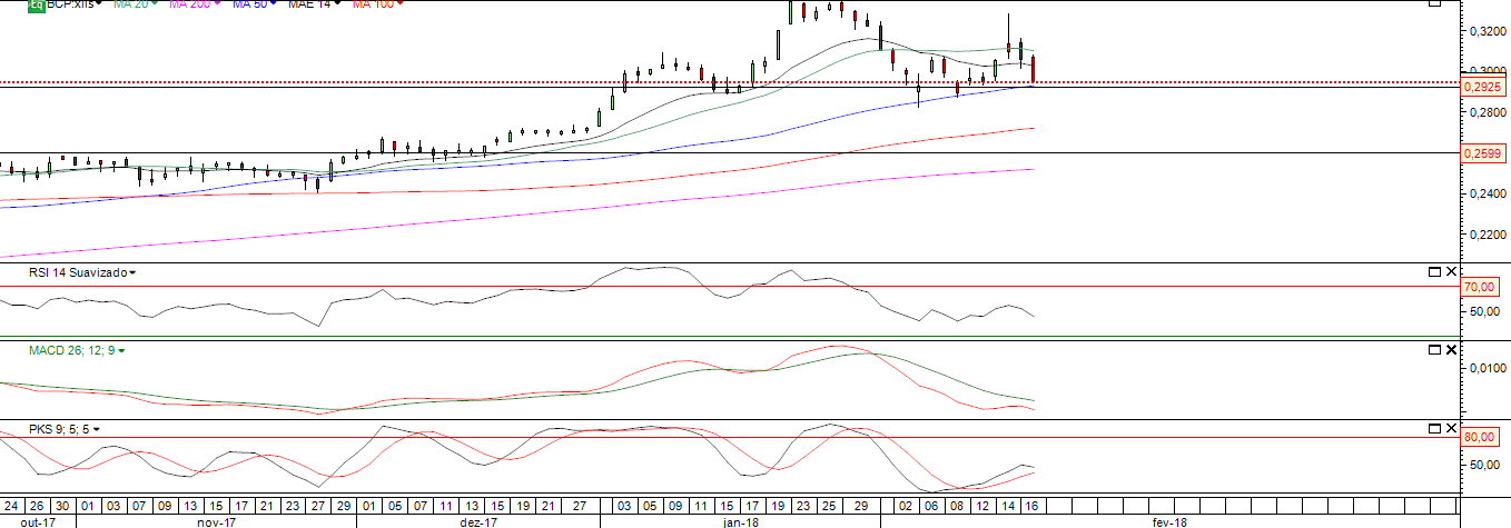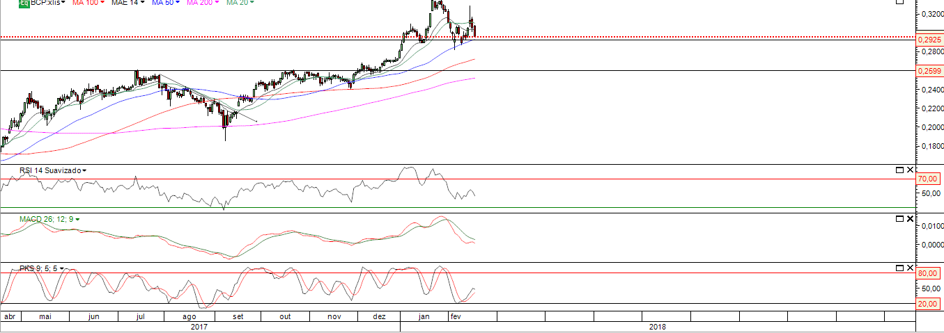 A minha expectativa para esta cotada é que vá nos próximos tempos testar a zona de suporte nos 0.29 e que corresponde á MM50 nos 0.292 e se quebrada a zona de suporte , ativaria o potencial H&S com target potencial na zona dos 0.26 indo nessa altura testar a MM200 que poderia constituir um forte suporte do titulo para tempos seguintes e que corresponderia também á anterior zona de resistência nos 0.26.